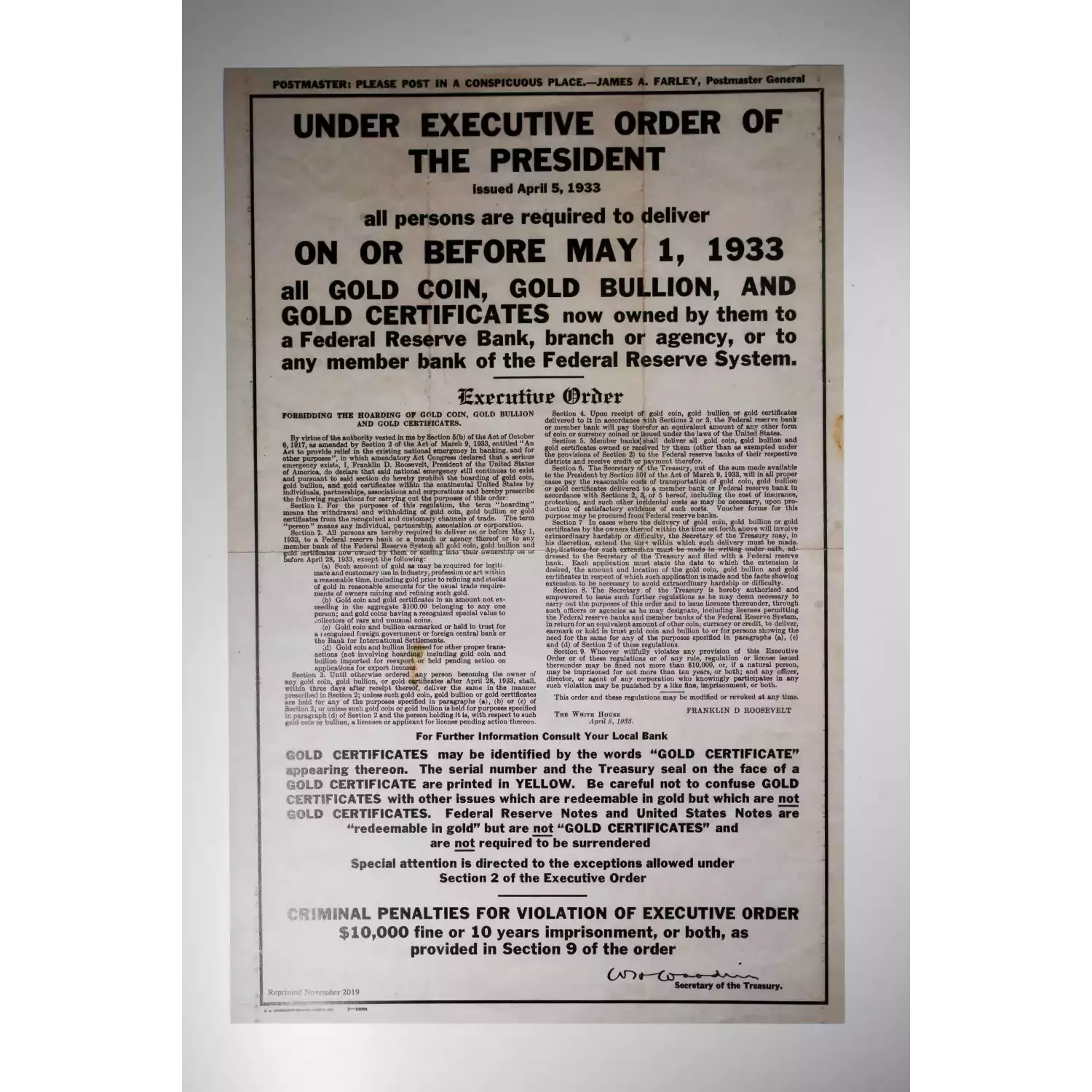 Executive Order 6102: FDR declares that it's illegal to hoard gold coin or gold certificates in excess of $100 except for specific uses and collections. The order states that all other gold coin and gold certificates must be redeemed by May 1, 1933 for $20.67 per Troy ounce.