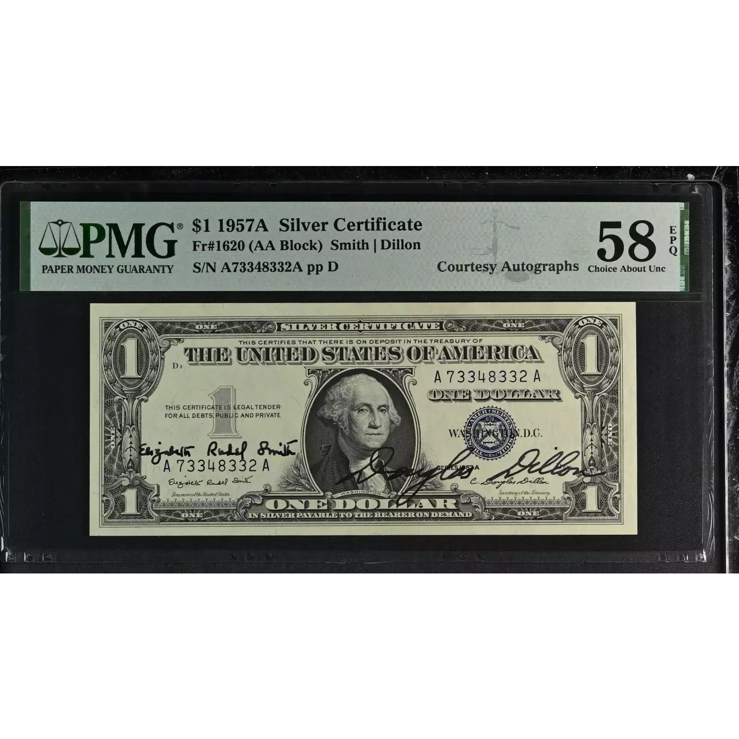 An attractive and seemingly uncirculated $1 blue seal with dark and legible autographs of the Treasurer of the United States (Smith) and the Secretary of the Treasury (Dillon.) Scarce dual autograph.