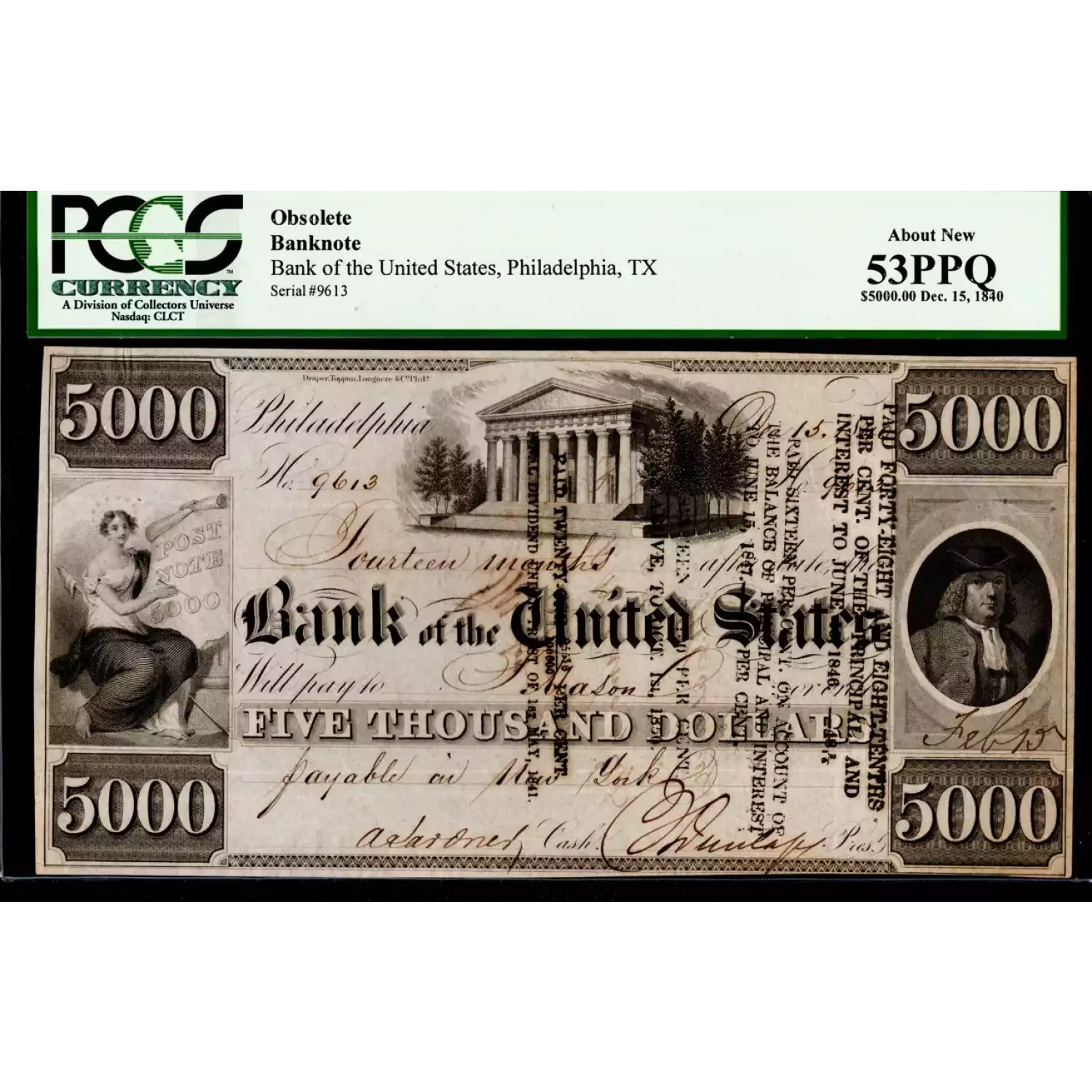 Sometimes known as the Third Bank of the United States, this bank retained its name but was operating under a Pennsylvania state charter from early 1836 until it suspended on September 4, 1841. This $5000 post note features the bank's headquarters in Philadelphia with a vignette of Liberty seated next to a scroll inscribed POST NOTE 5000 on the left and a portrait of William Penn on the right. This note has retained original surfaces and exceptional eye-appeal making this an intelligent selection for a collector that's been waiting for this elusive note to surface. It's the first we've owned in several years as they're not nearly as available as they once were.