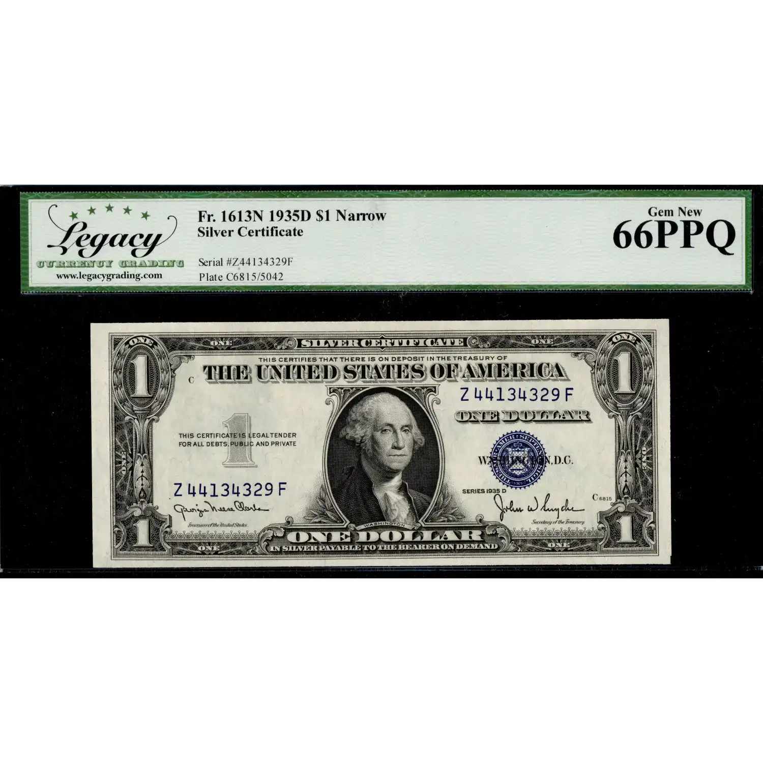 To determine if a $1 1935-D silver certificate is "wide" or "narrow," look at the space below the "ONE DOLLAR" on the back of the note; a wider gap indicates a wide variety, while a smaller gap signifies a narrow variety; you can also check the back plate number, with numbers below 5015 generally being wide and numbers above 5017 being narrow. This particualr example is a Narrow $1 1935-D Silver Certificate from Back Plate #5042 and has exceptional eye-appeal with even margins and original surfaces.