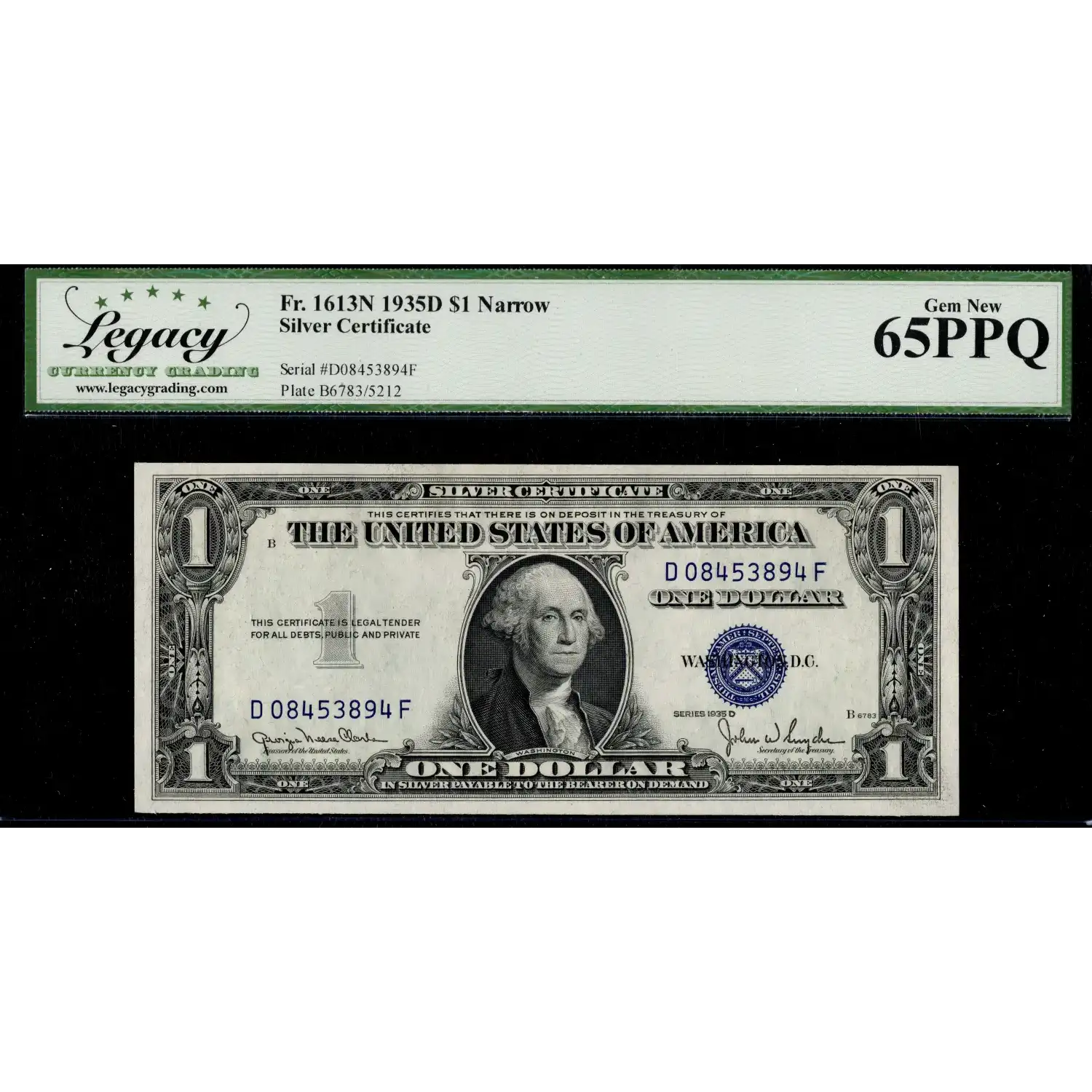 To determine if a $1 1935-D silver certificate is "wide" or "narrow," look at the space below the "ONE DOLLAR" on the back of the note; a wider gap indicates a wide variety, while a smaller gap signifies a narrow variety; you can also check the back plate number, with numbers below 5015 generally being wide and numbers above 5017 being narrow. This particualr example is a Narrow $1 1935-D Silver Certificate from Back Plate #5123 and has exceptional eye-appeal with even margins and original surfaces.