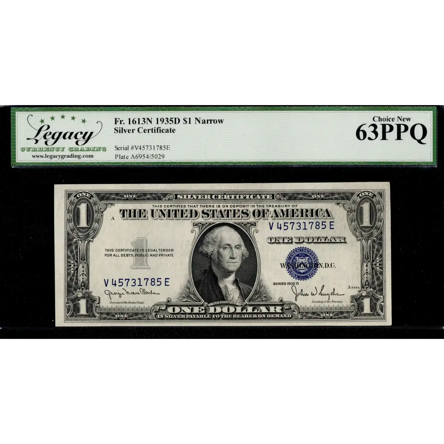 To determine if a $1 1935-D silver certificate is "wide" or "narrow," look at the space below the "ONE DOLLAR" on the back of the note; a wider gap indicates a wide variety, while a smaller gap signifies a narrow variety; you can also check the back plate number, with numbers below 5015 generally being wide and numbers above 5017 being narrow. This particualr example is a Narrow $1 1935-D Silver Certificate from Back Plate #5029 and has exceptional eye-appeal with even margins and original surfaces.