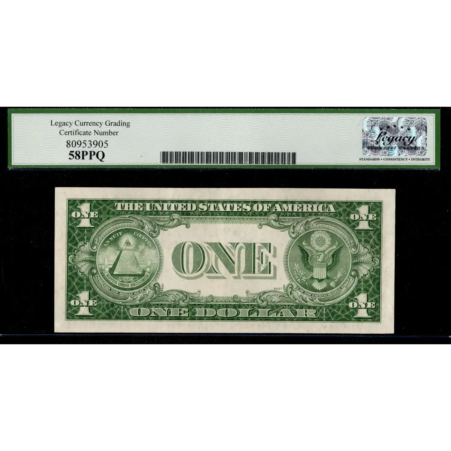 To determine if a $1 1935-D silver certificate is "wide" or "narrow," look at the space below the "ONE DOLLAR" on the back of the note; a wider gap indicates a wide variety, while a smaller gap signifies a narrow variety; you can also check the back plate number, with numbers below 5015 generally being wide and numbers above 5017 being narrow. This particualr example is a Narrow $1 1935-D Silver Certificate from Back Plate #5027 and has exceptional eye-appeal with even margins and original surfaces.