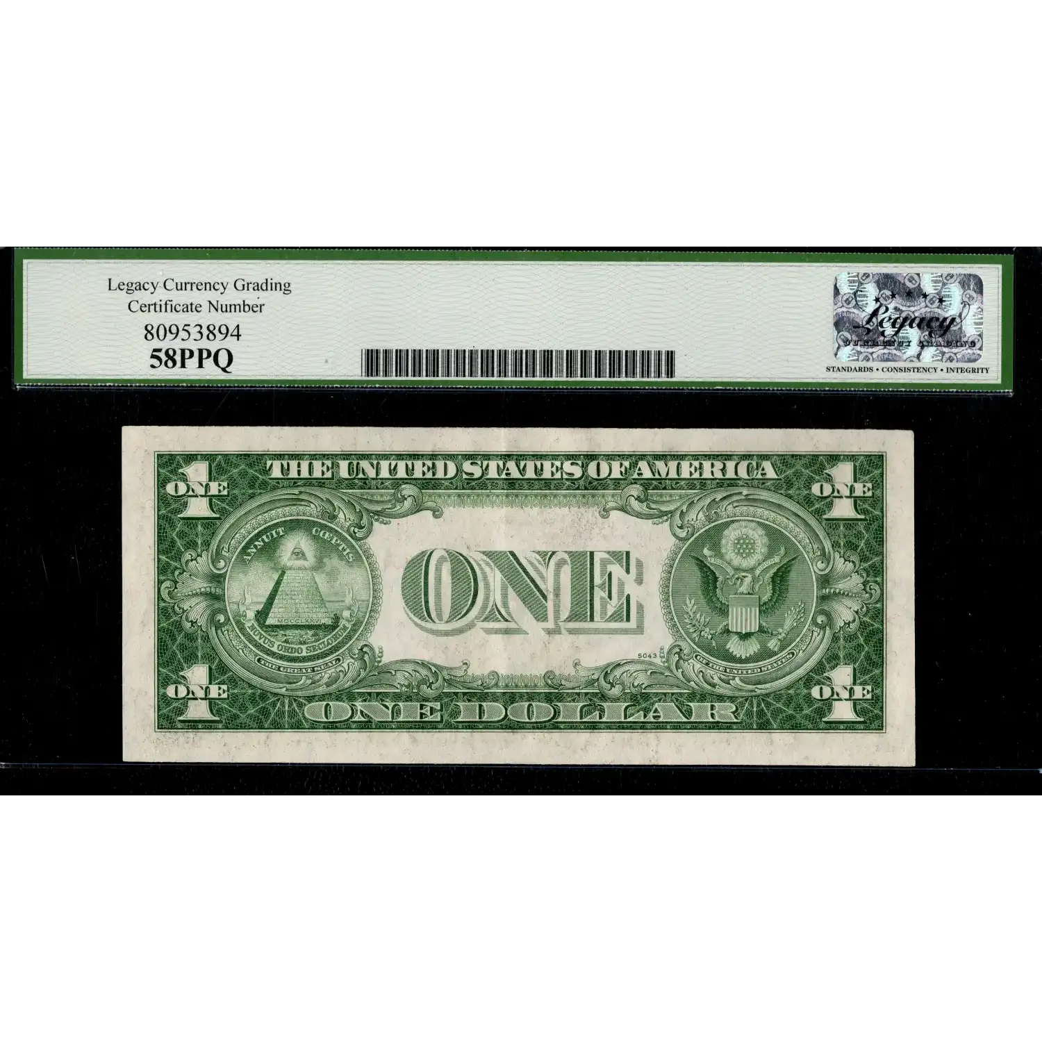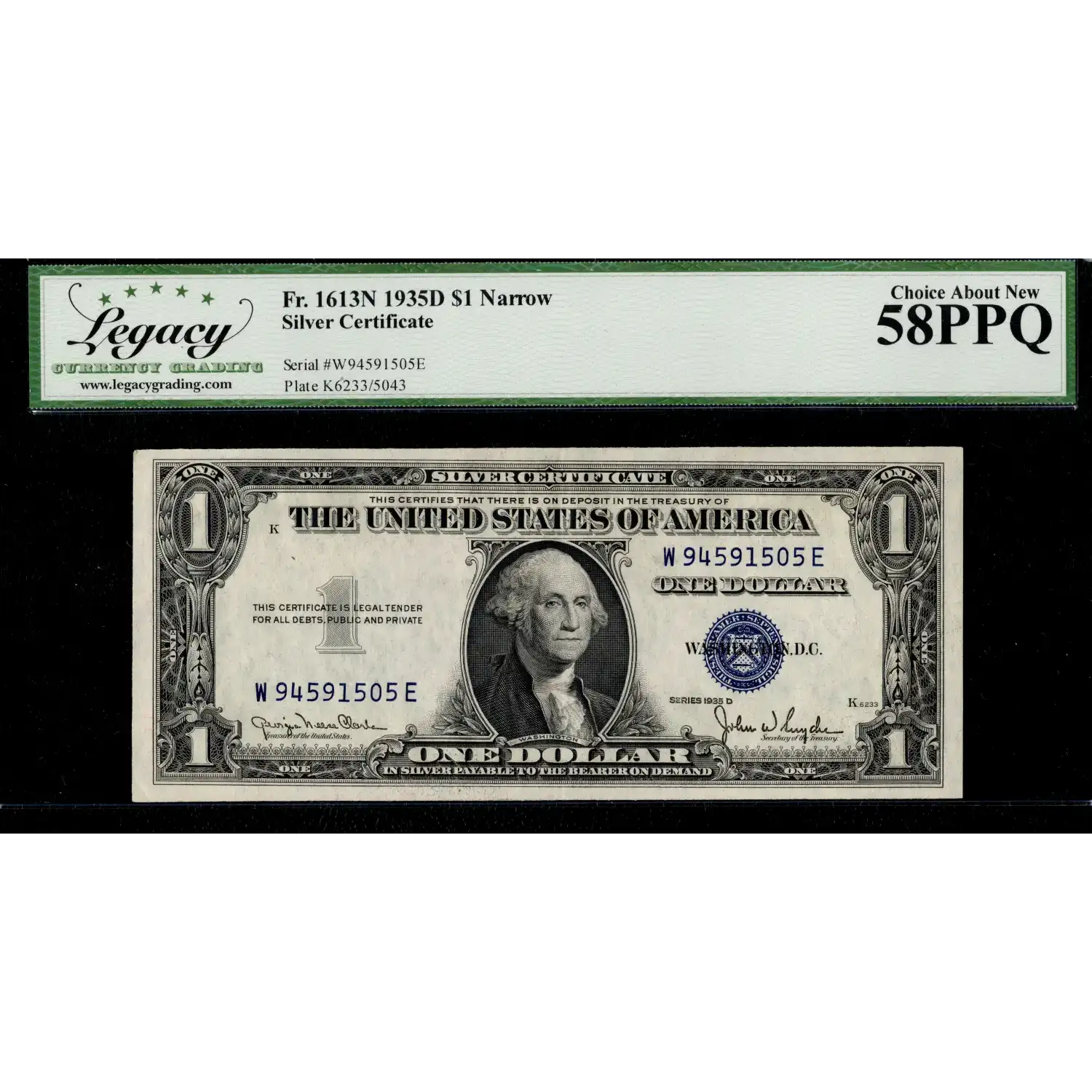 To determine if a $1 1935-D silver certificate is "wide" or "narrow," look at the space below the "ONE DOLLAR" on the back of the note; a wider gap indicates a wide variety, while a smaller gap signifies a narrow variety; you can also check the back plate number, with numbers below 5015 generally being wide and numbers above 5017 being narrow. This particualr example is a Narrow $1 1935-D Silver Certificate from Back Plate #5043 and has exceptional eye-appeal with even margins and original surfaces.