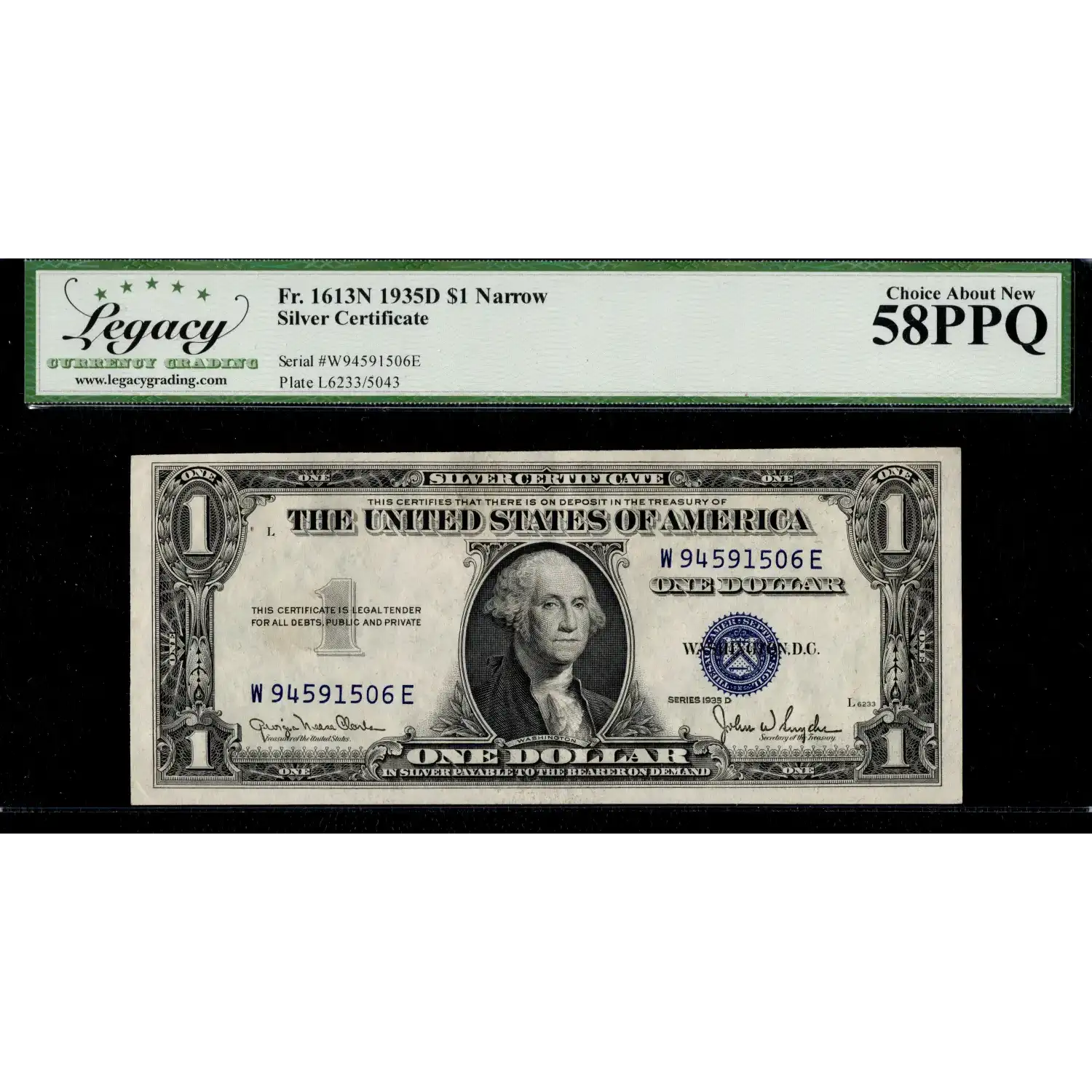 To determine if a $1 1935-D silver certificate is "wide" or "narrow," look at the space below the "ONE DOLLAR" on the back of the note; a wider gap indicates a wide variety, while a smaller gap signifies a narrow variety; you can also check the back plate number, with numbers below 5015 generally being wide and numbers above 5017 being narrow. This particualr example is a Narrow $1 1935-D Silver Certificate from Back Plate #5043 and has exceptional eye-appeal with even margins and original surfaces.