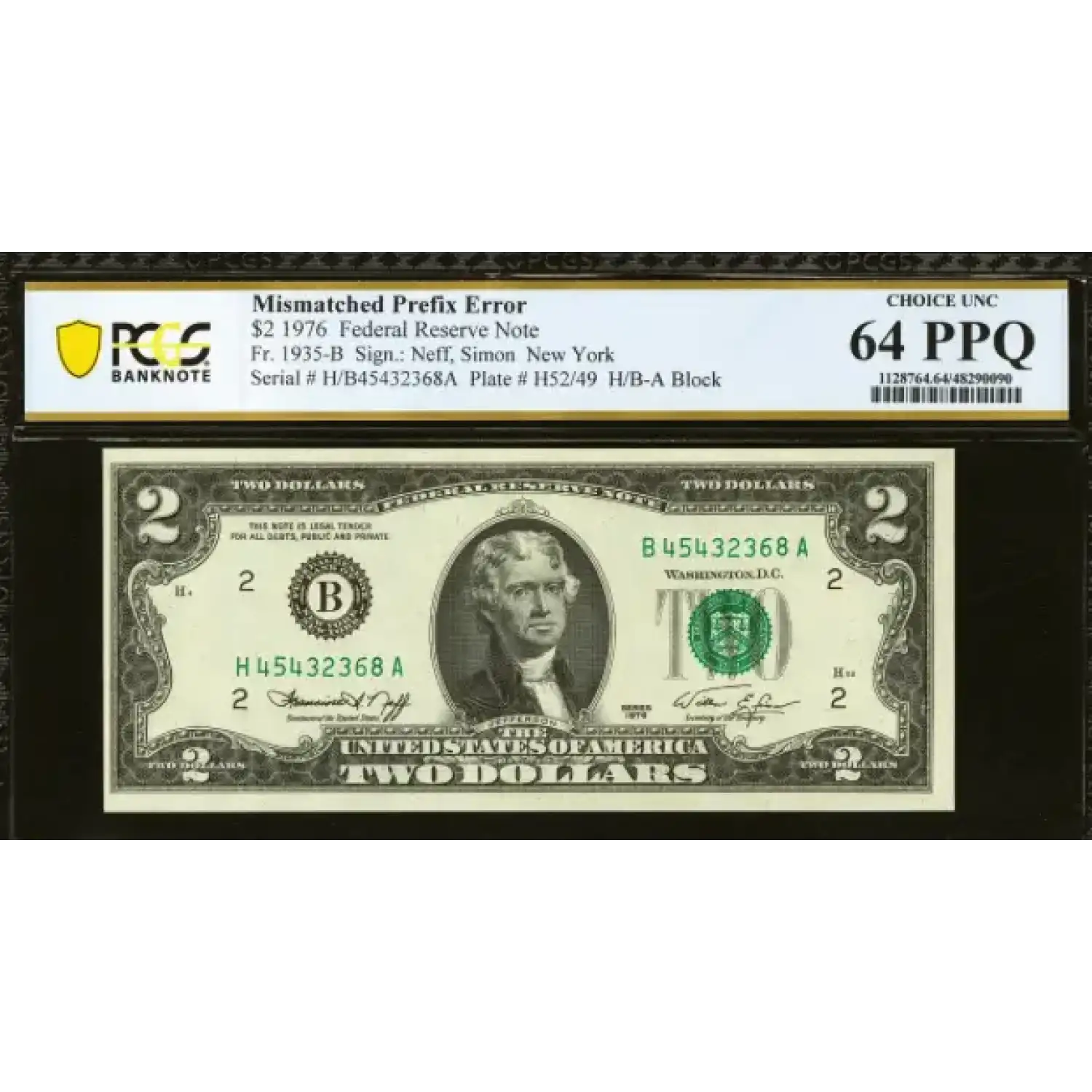 From the NY district, the lower left serial begins with H…instead of B as it correctly appears on the upper right. Readily identifiable and really cool. Enjoy this error bicentennial deuce preserved in pristine condition!