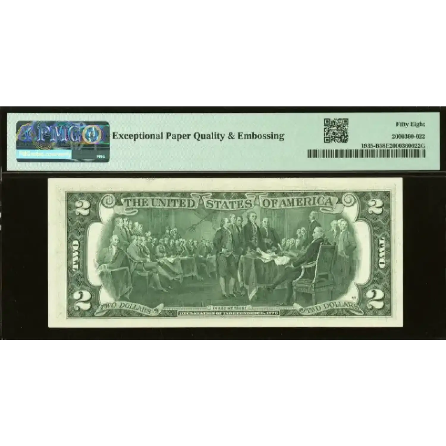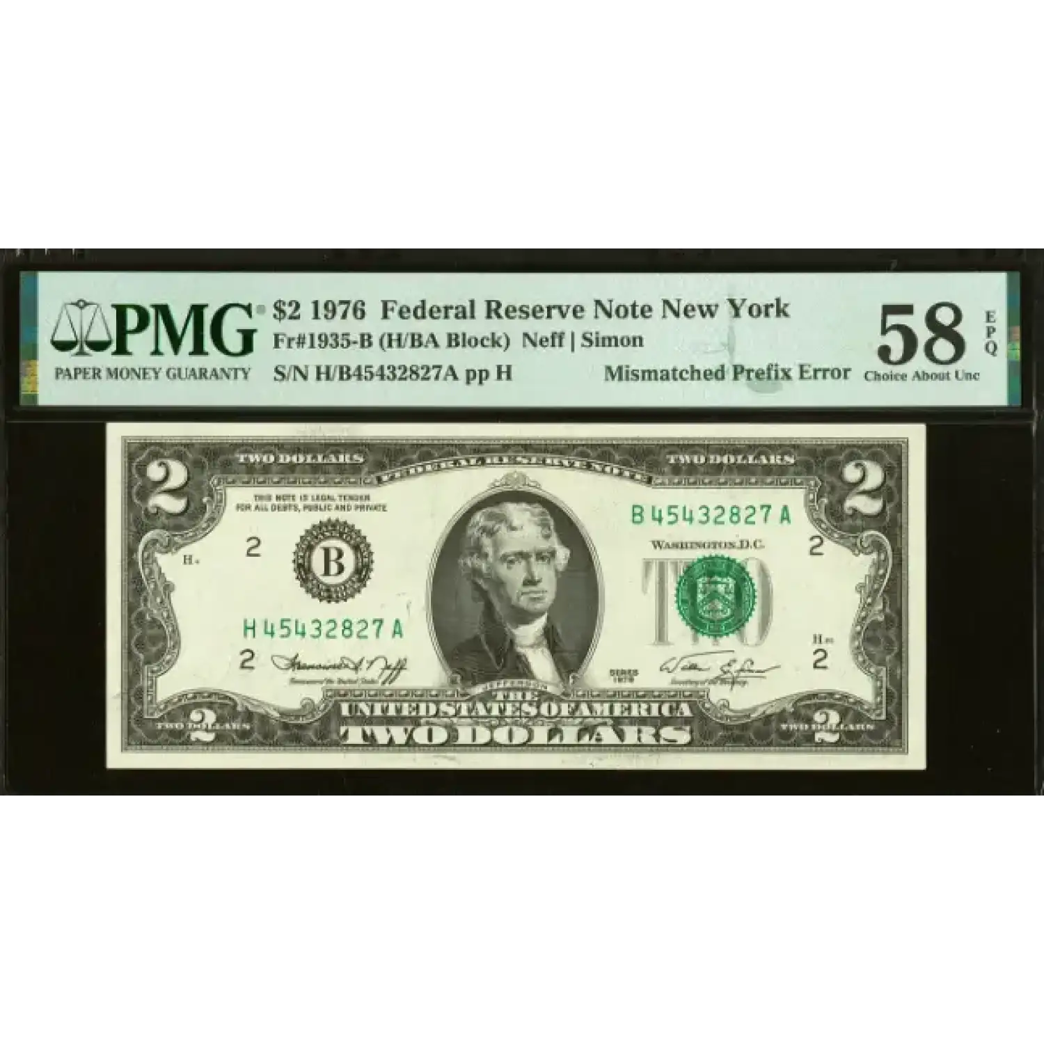 From the NY district, the lower left serial begins with H…instead of B as it correctly appears on the upper right. Readily identifiable and really cool. Enjoy this error bicentennial deuce preserved in seemingly uncirculated condition with positive comments from PMG on the back of the holder: "Exceptional Paper Quality & Embossing."