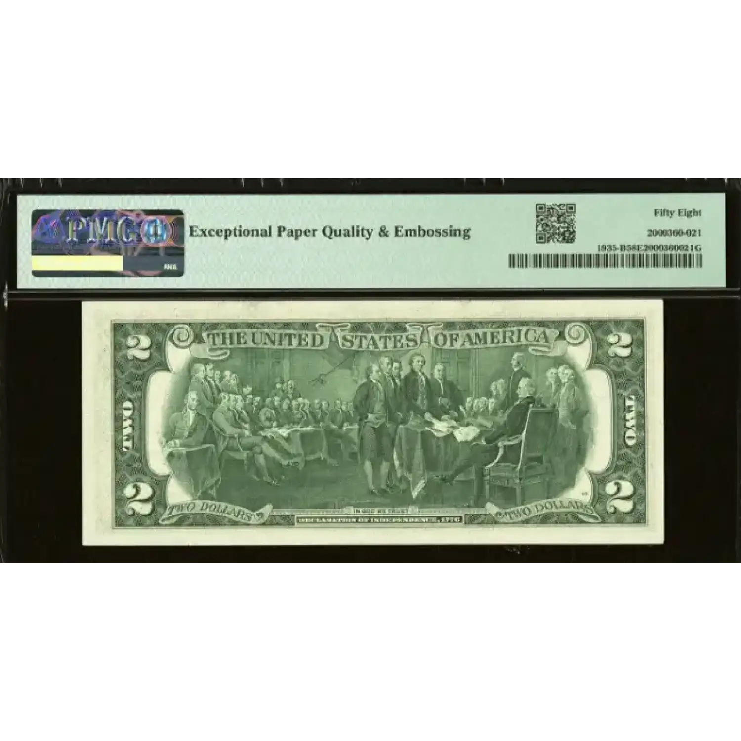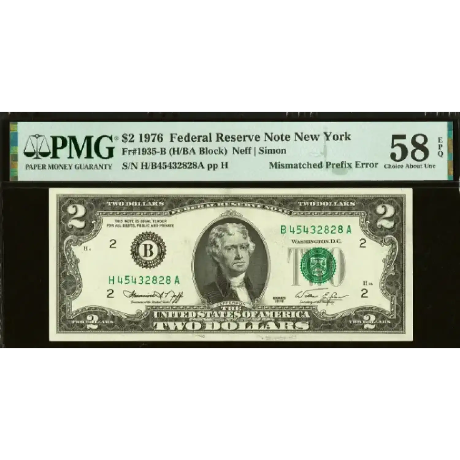 From the NY district, the lower left serial begins with H…instead of B as it correctly appears on the upper right. Readily identifiable and really cool. Enjoy this error bicentennial deuce preserved in seemingly uncirculated condition with positive comments from PMG on the back of the holder: "Exceptional Paper Quality & Embossing."