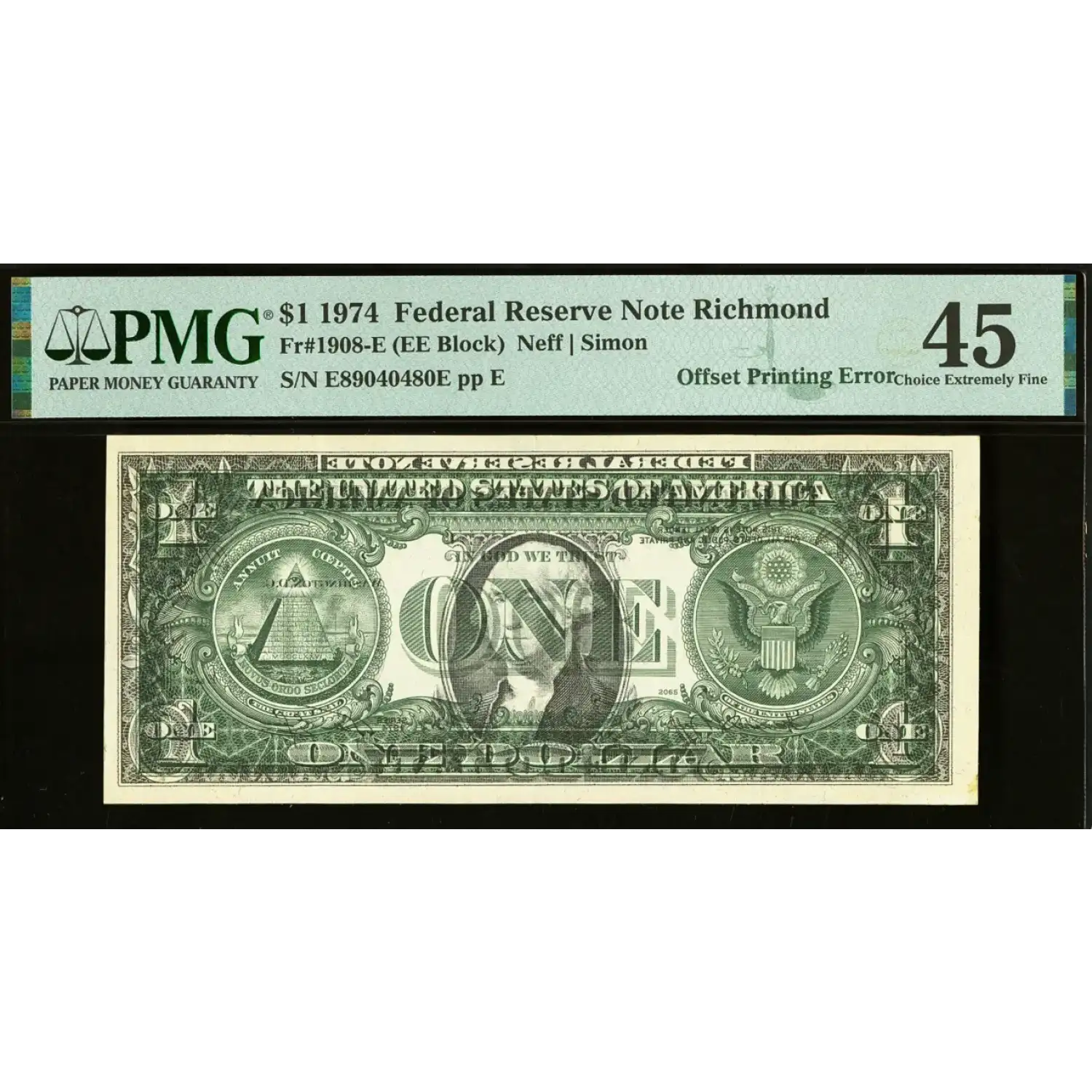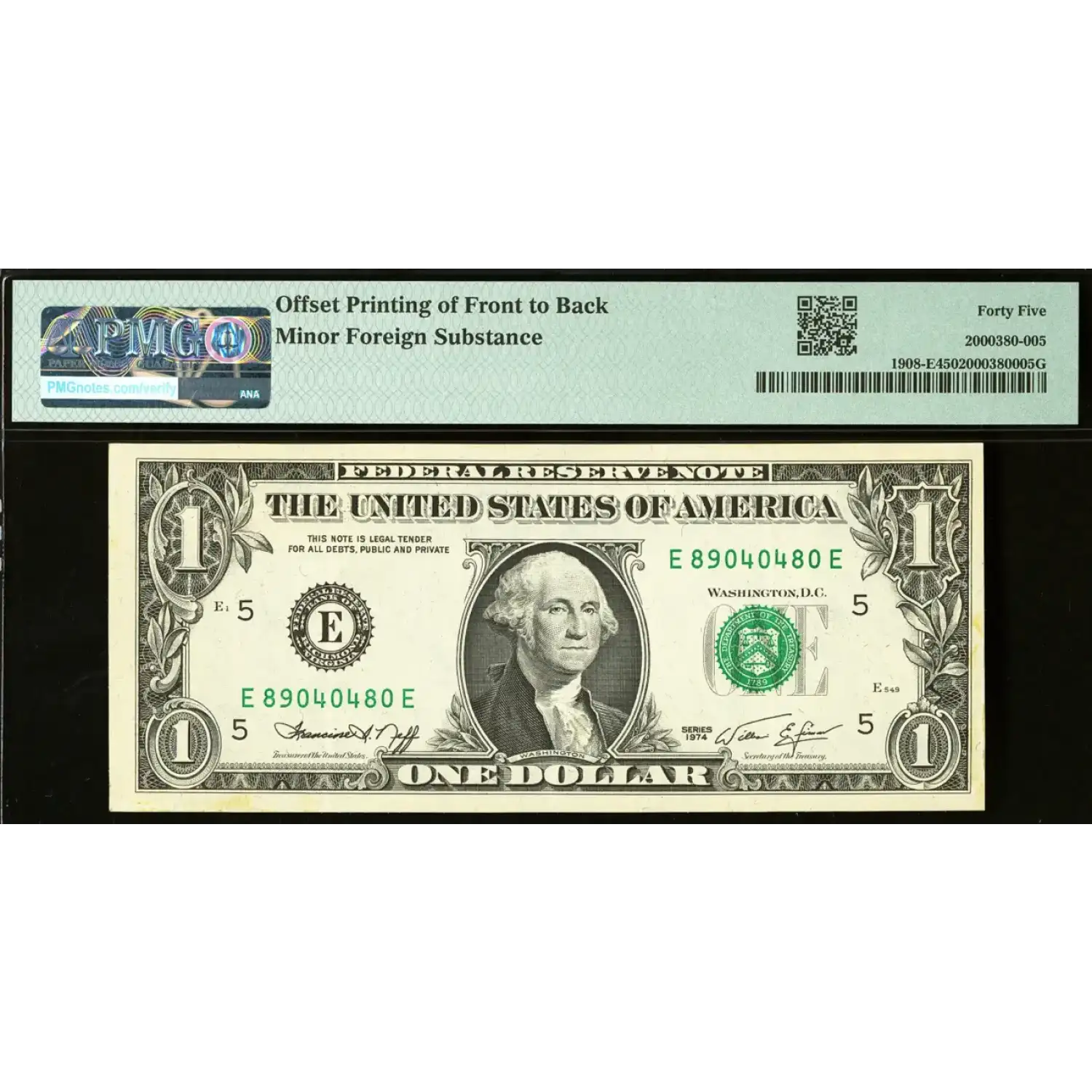 A dark and complete face to back offset error that puts George Washington on each side looking in opposite directions. Minor foreign substance is noted in reference to the faint area in the bottom margin on its non-error side.