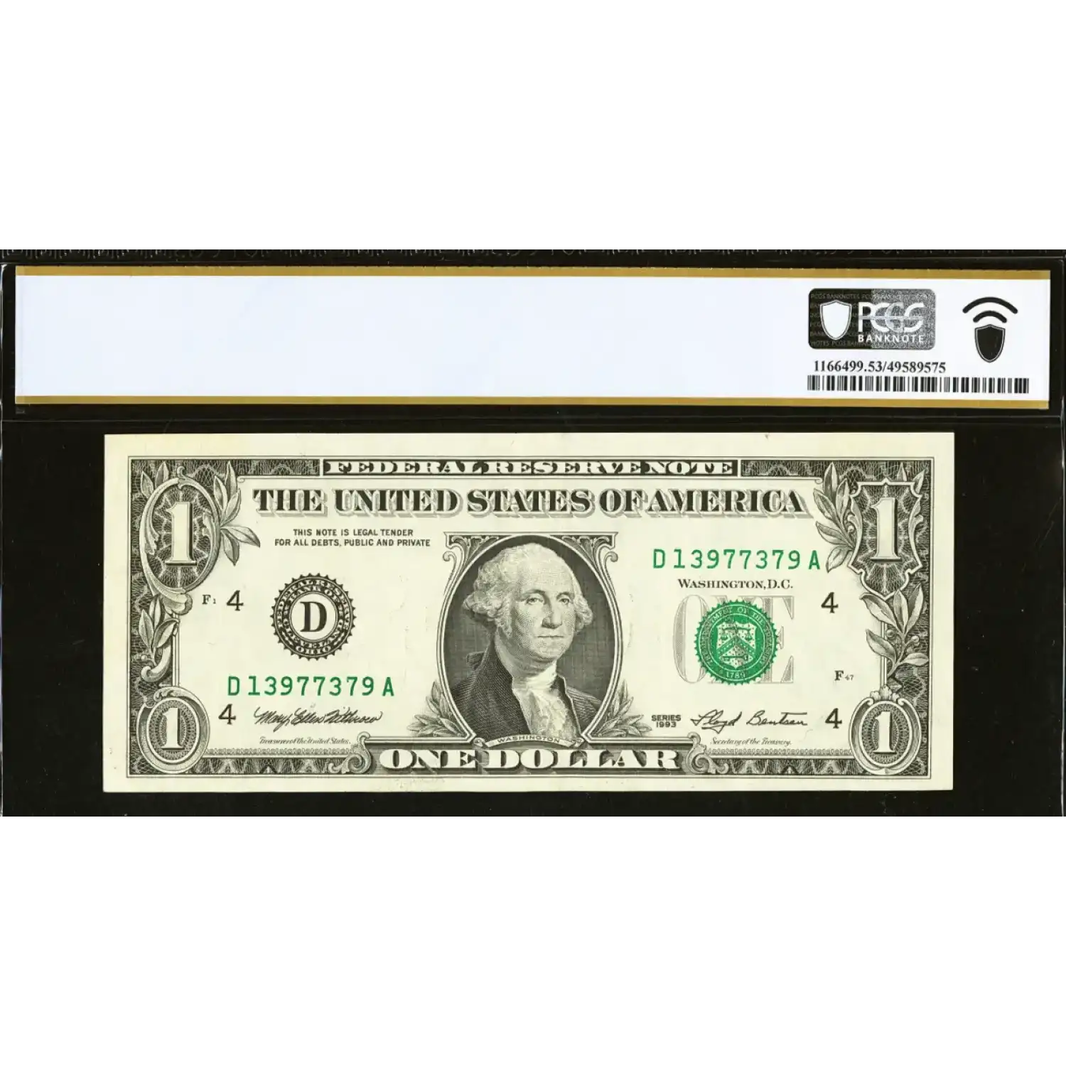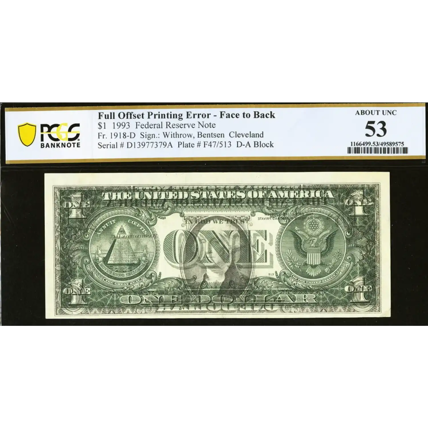A dark and double sided Washington as our nation's first president appears on each side looking in opposite directions. This note is preserved in About Uncirculated condition with a full face to back offset error.