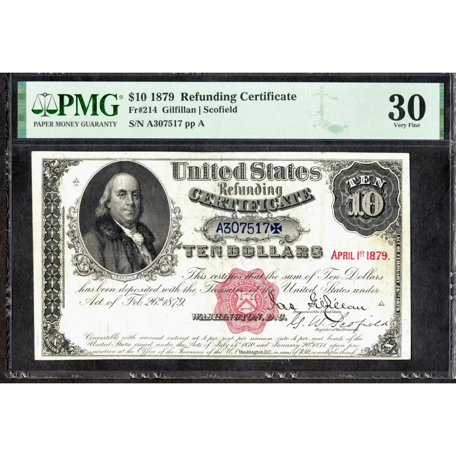 An attractive, mid-grade example of the unusual-sized Refunding Certificate is offered here. Friedberg 214 notes were really circulating bonds that could be purchased by the average person through the Post Office. Banks put them aside in order to earn their interest, too. The interest was capped by Congress in 1907 and their value set at $21.30 each. At that time, there was no longer a need to hold onto them and most all were redeemed. This example has solid paper and nice margins. Most impressively, it remains free of any negative comments or problems making it a rare treat for the grade and type as many come with flaws and restoration.