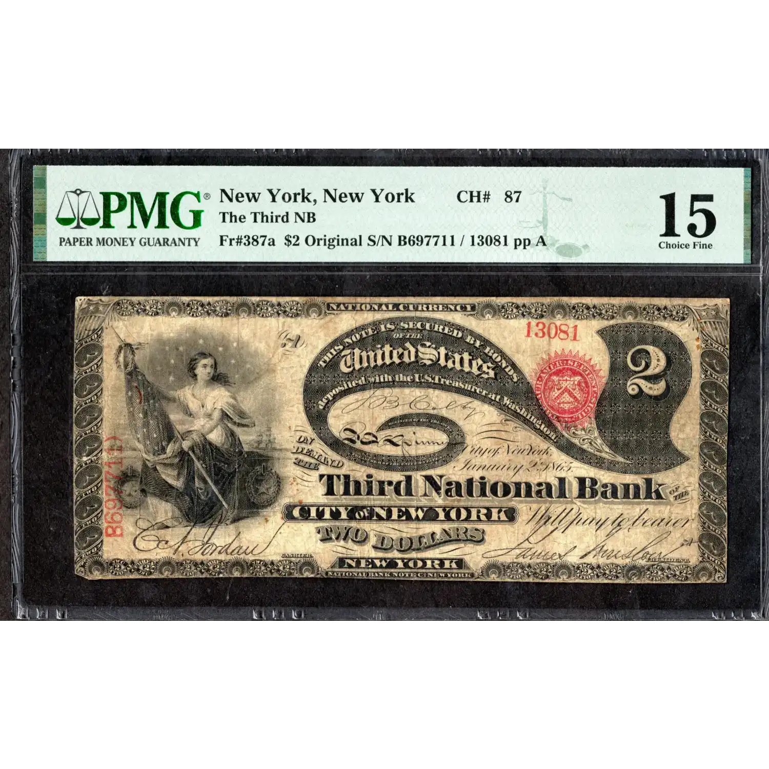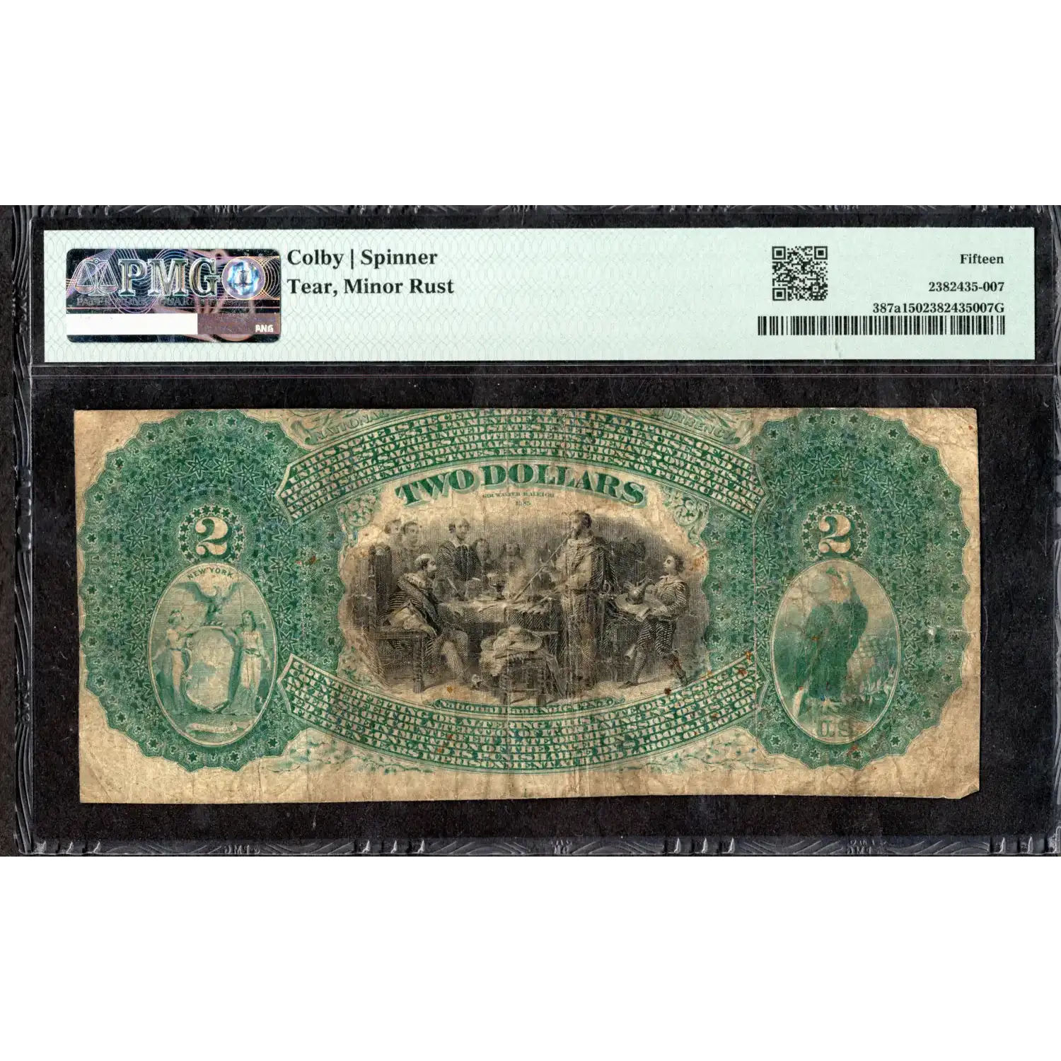 Only large size notes were issued by this low charter number New York City bank, which commenced business in 1863 and folded in 1897. Dark inks and legible signatures add to the appeal of this well margined and colorful Original Series Lazy Deuce. PMG mentions small tear in left margin and a few flecks of rust on the back which seem a bit trivial for the grade--particularly because most notes graded Ch Fine 15 don't look this nice. Would it be wrong for this to be in a 20 holder? I don't think so, but if were recent sales for a repaired and restored 20 with a lesser look exceeded $4k, so enjoy this one a bit cheaper with a more attractive appearance. A perfect type note for a collector that's been waiting for an attractive and affordable Lazy Deuce to enter the market.