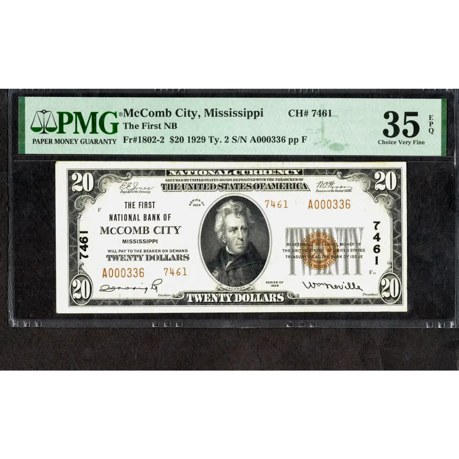 A lovely note that is new to the census and now makes just the third Type 2 $20 to be reported from this Pike County bank and one of only six small size type II notes across all denominations. It is the second finest to surface from here with the best being a 55 and the majority falling in the heavily circulated Fine range. This well margined note shows only minimal traces of circulation and maintains full originality. Most impressively, it is the ONLY note available with the PPQ/ EPQ designation. I don't know about you, but I'd take a fully-original Ch VF 35EPQ over a pressed 55 that's considered the finest known.