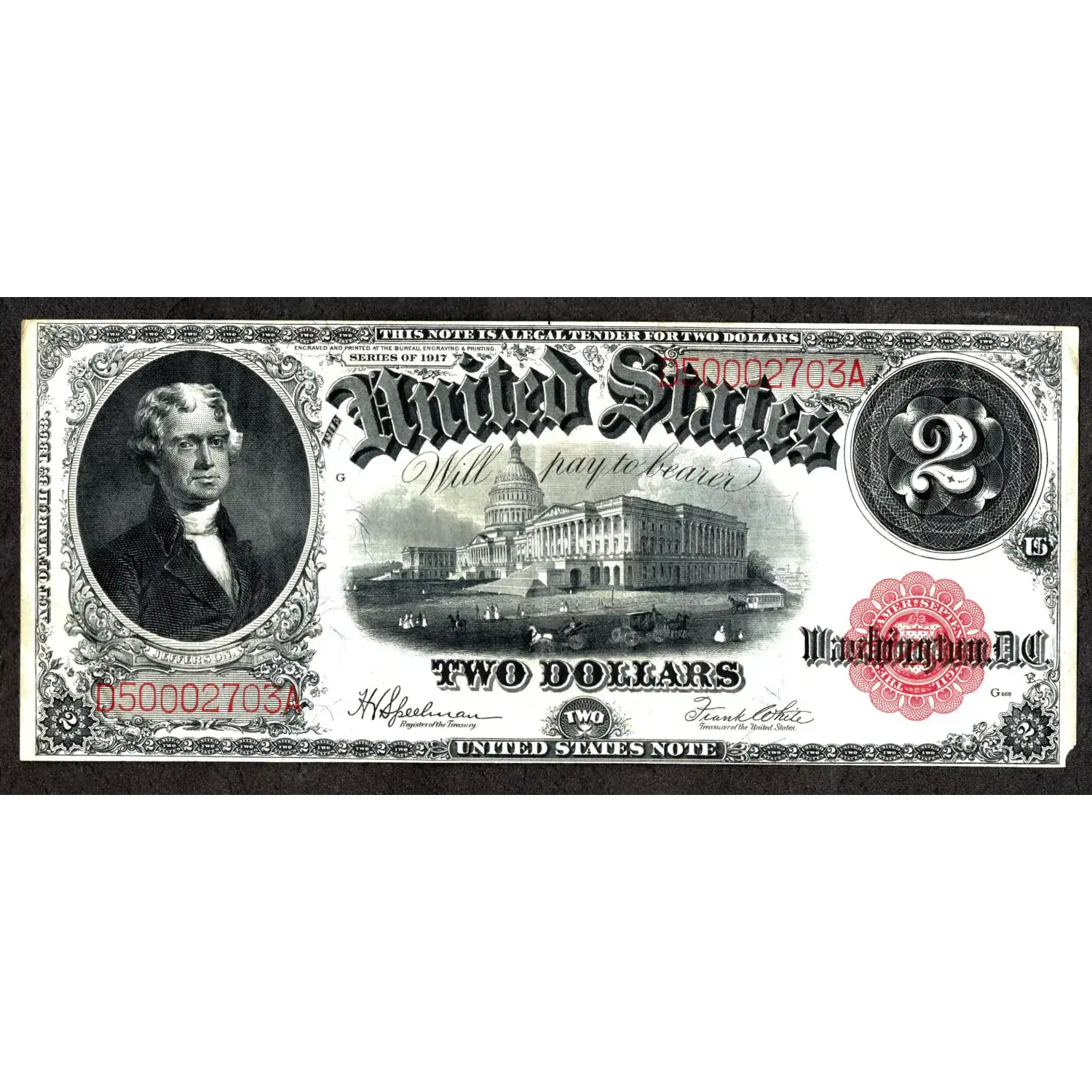 An attractive red seal deuce featuring Thomas Jefferson at left with an intricate and ornate back that earned the nickname, "Pearl Bracelet" for this one year type featuring the Speelman-White signature combination. Enjoy a significant discount for a barely-noticeable flaw; did you notice the bottom right corner? Take a peek and decide if this beauty is a good fit for your collection.
