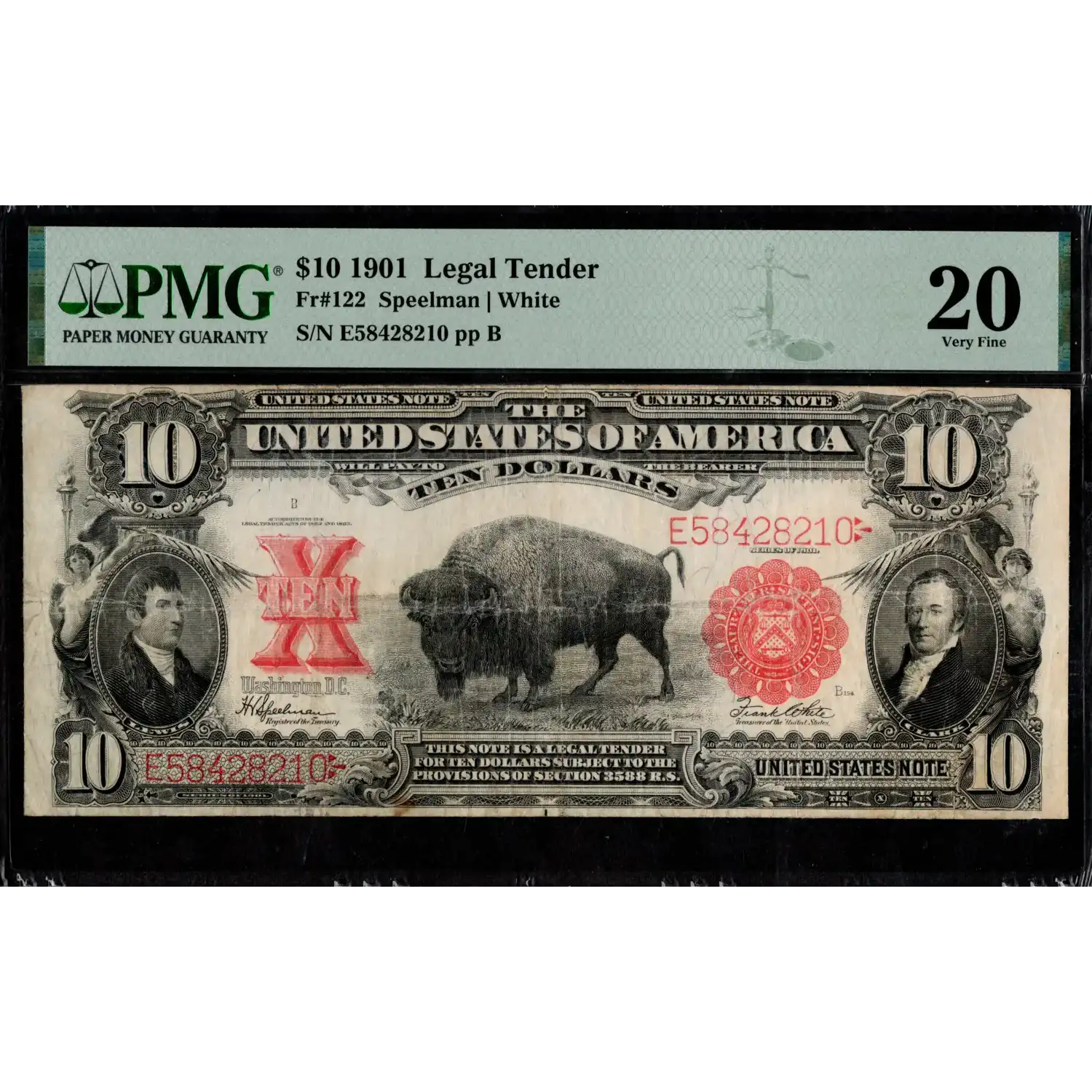 An attractive and problem-free example of an iconic design that belongs in every large size collection of US Paper Money! This $10 1901 Legal Tender "Bison" note features Lewis and Clark on each side of the face near the vibrant red overprint. Many come with severe probelms such as rips, writing, stains, and ugly bleedthrough of the overprint onto the back, but we're pleased this note has been preserved in ideal collector condition allowing us to offer a note at the perfect intersection of attractive and affordable.