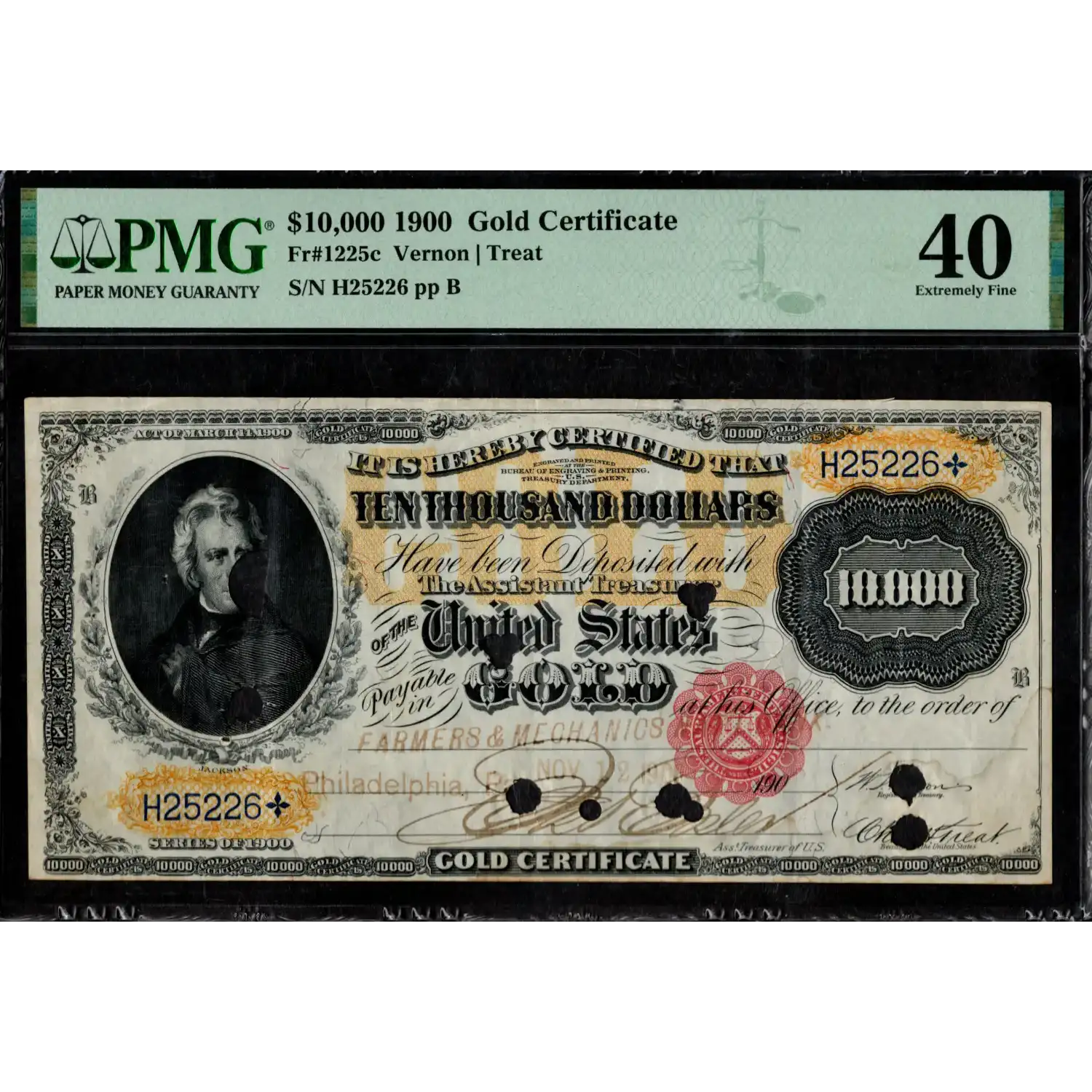 An exceptionally clean XF note with paper originality that hails from a tougher Friedberg number for this unredeemable note. Fr. 1225c is often found payable to a national bank. In this case it is the Farmers & Mechanics National Bank of Philadelphia. The note does have the usual hole punch cancels, as that was the fate that awaited all examples of this design with the Vernon-Treat Treasury signature combination along with the comment of 'stains' as a poignant reminder of the time this spent in a blazing fire before being doused by fire hoses and saved and preserved for collectors to appreciate.