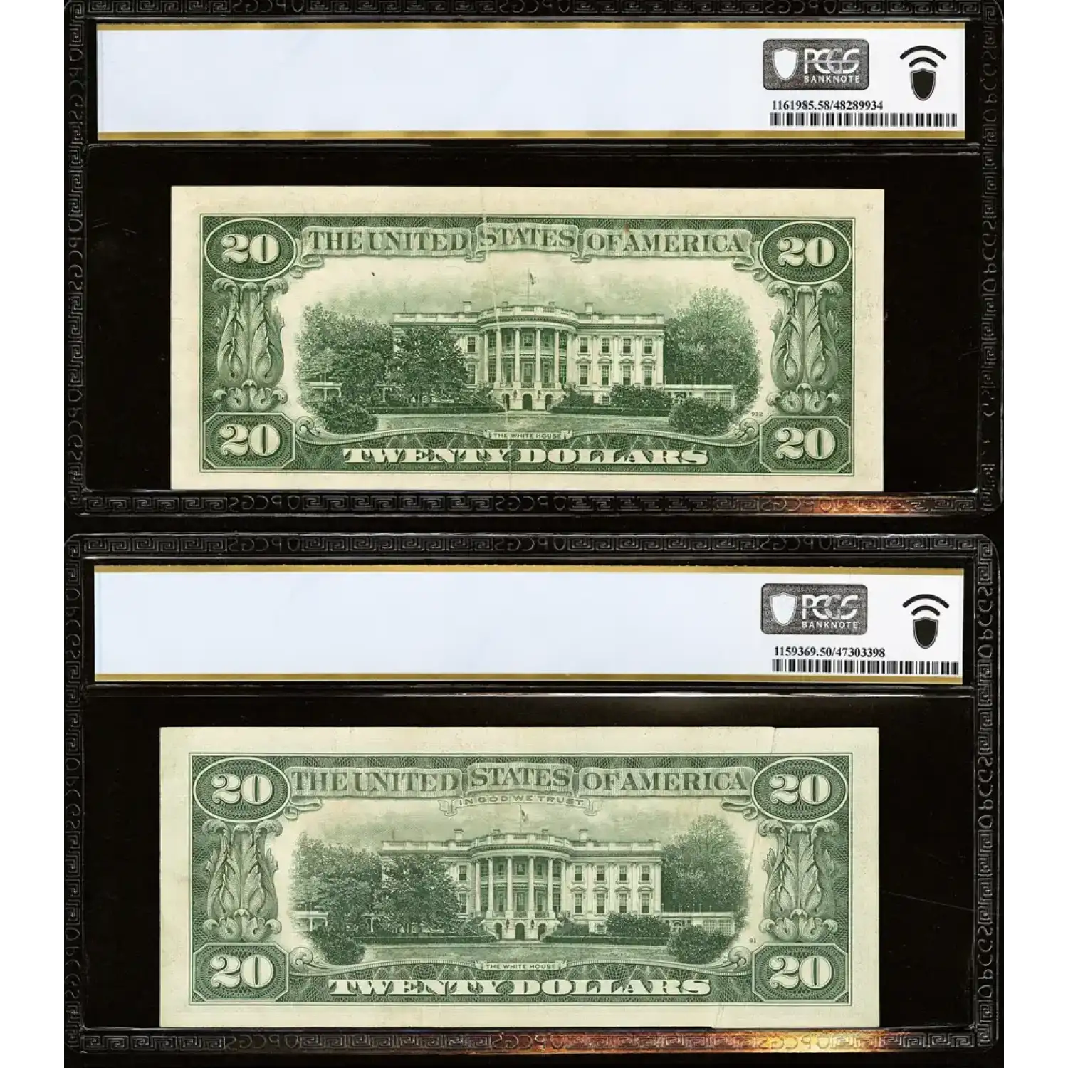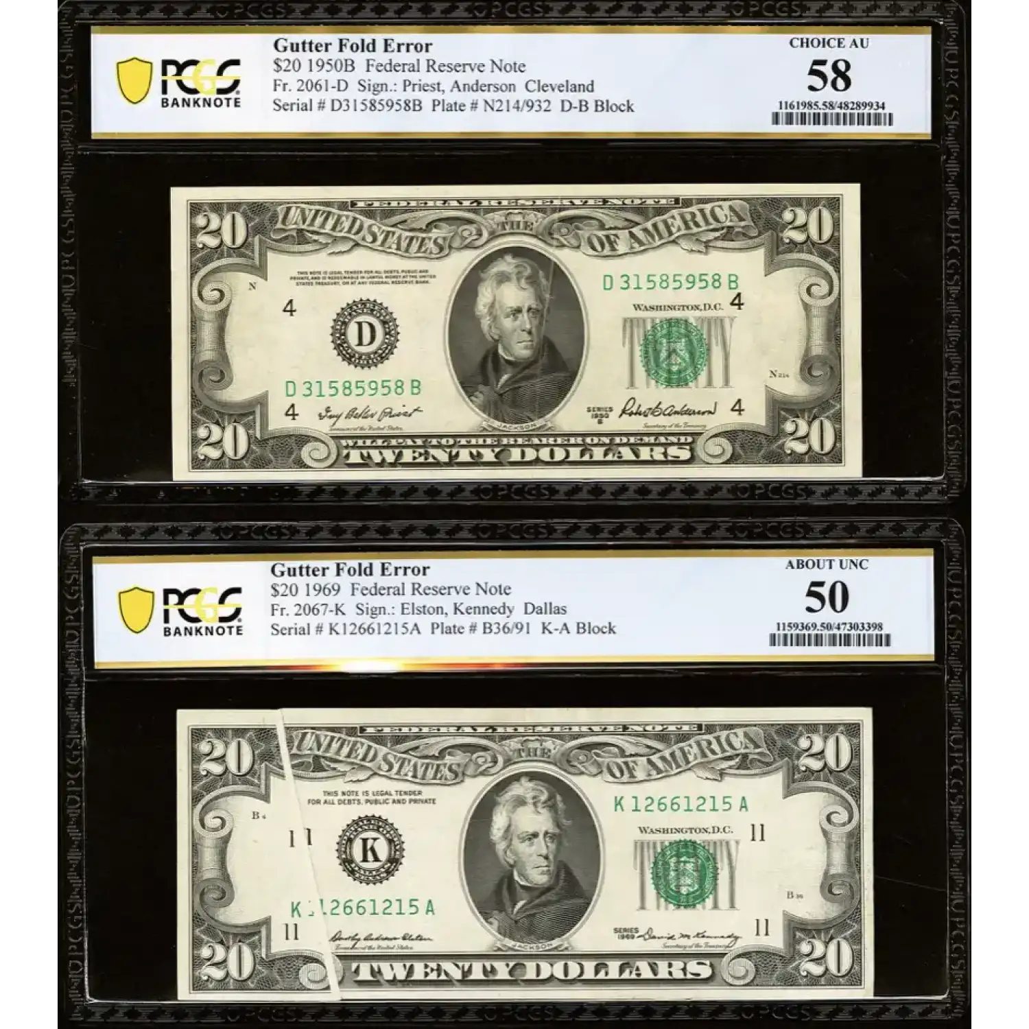 An exciting offering featuring not one but TWO $20 GUTTER FOLD ERRORS preserved in About Uncirculated condition and certified by PCGS. While the 1950-B mistake takes an extra second to observe the lengthy gutter that runs through Jackson's portrait oval, the 1969 example can be spotted across the room! Two fun errors offered together for an attractive price.