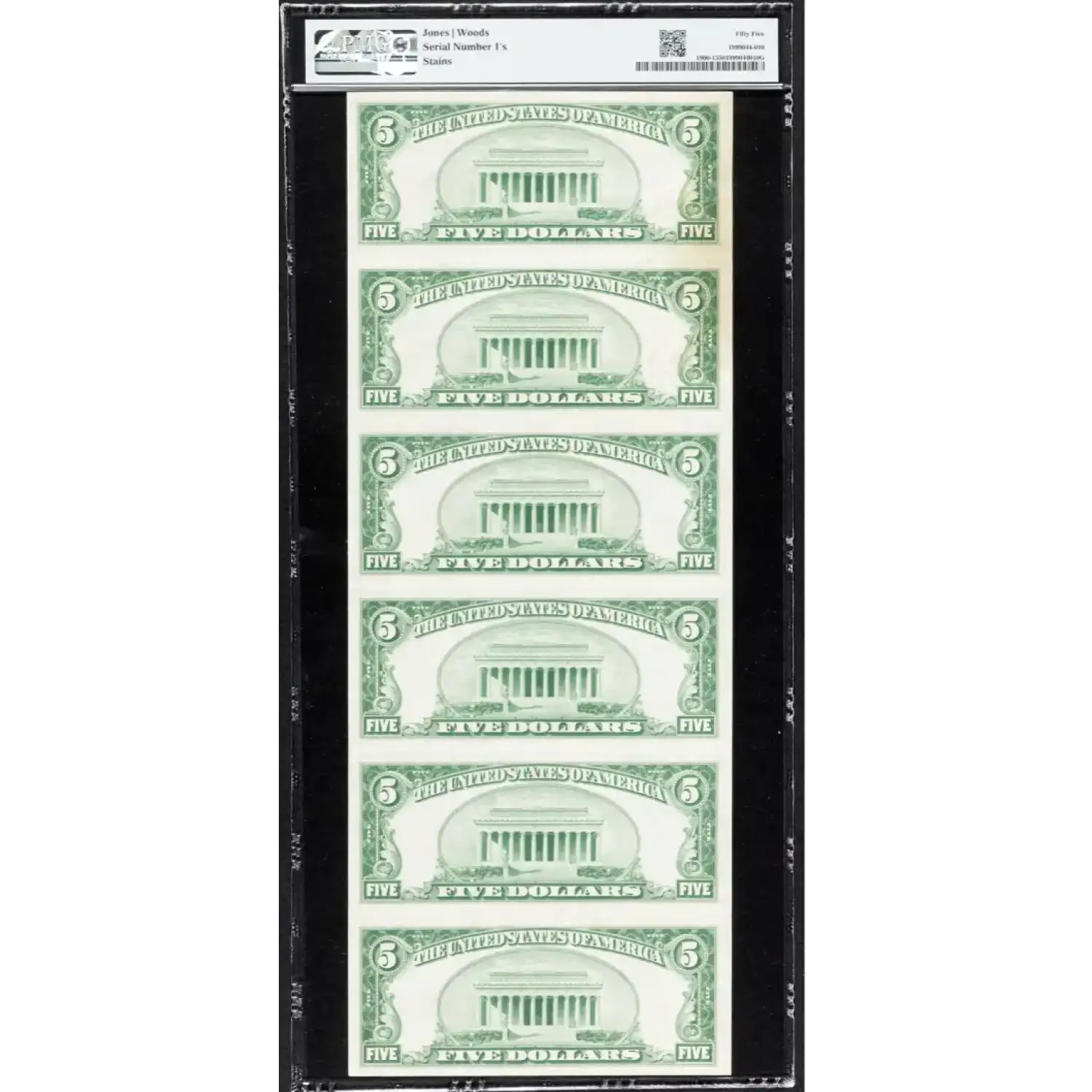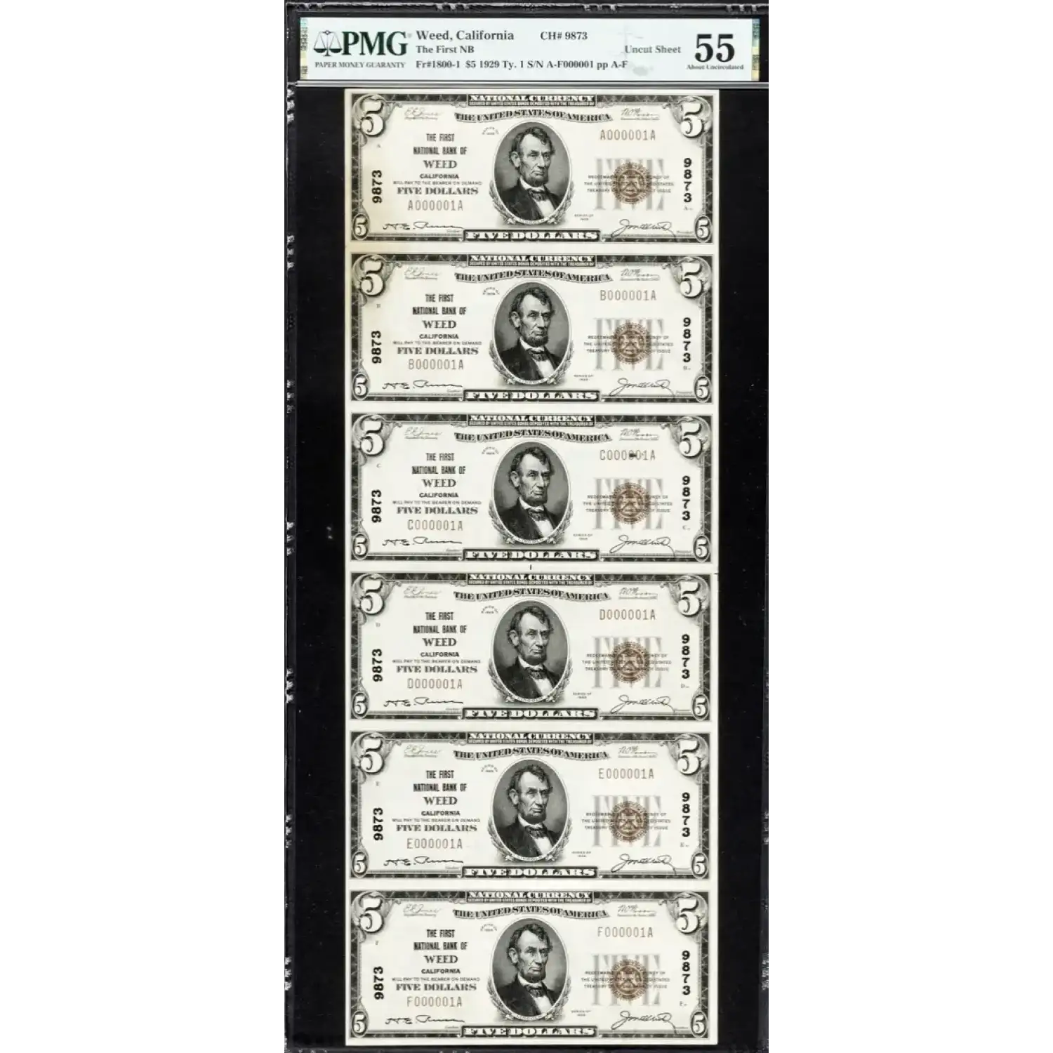 Serial Number 1 Weed, CA - $5 1929 Ty. 1 The First National Bank Ch. # 9873 Uncut Sheet PMG About Uncirculated 55.