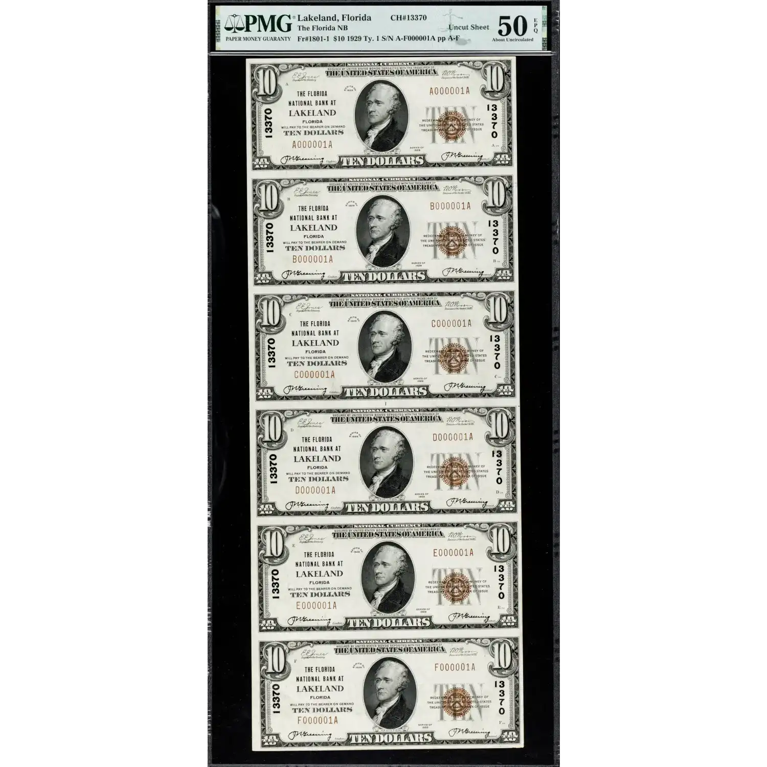 Serial Number 1 Lakeland, FL - $10 1929 Ty. 1 The Florida National Bank Ch. # 13370 Uncut Sheet PMG About Uncirculated 50 EPQ.