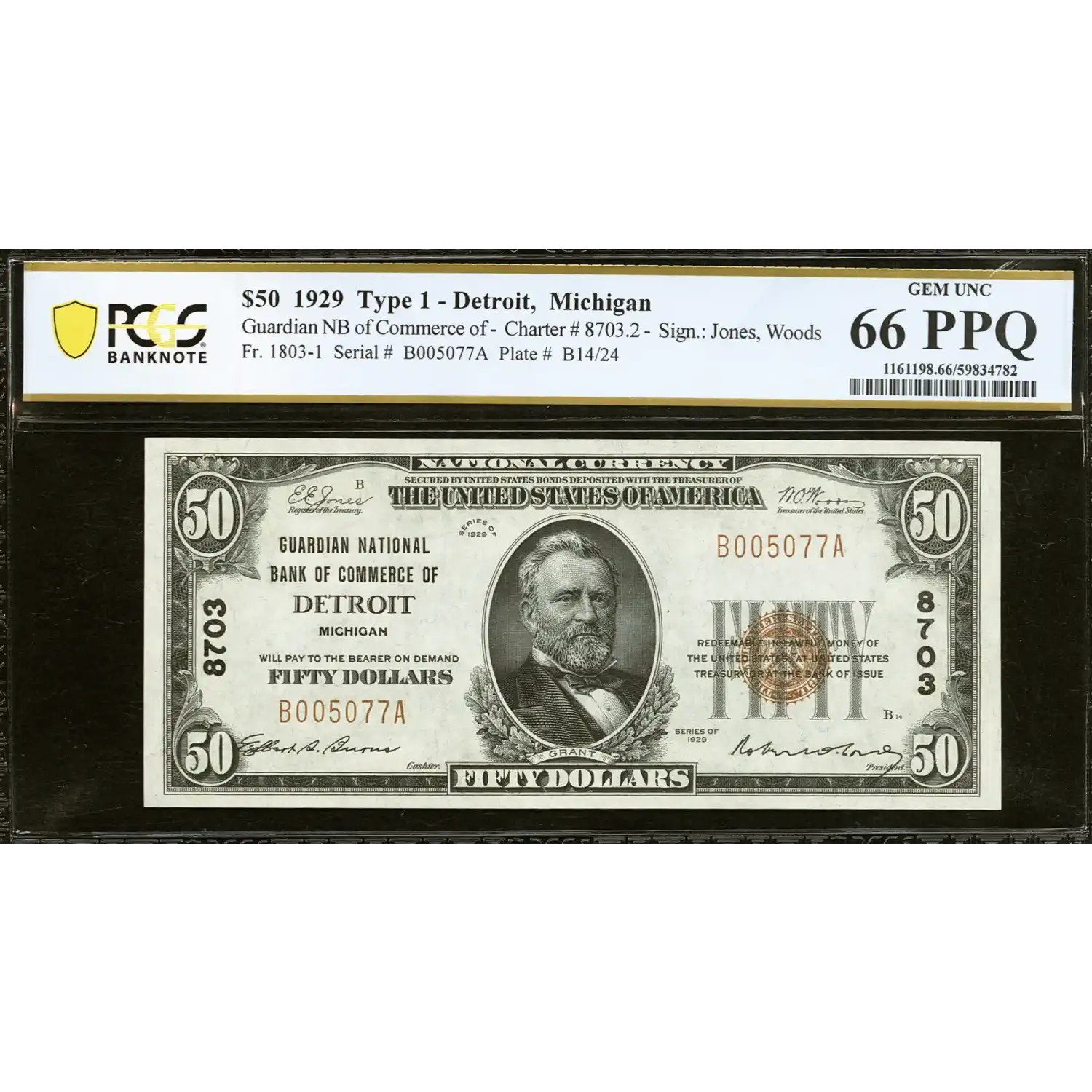 This most attractive example represents a scarce type and denomination that was issued by only seven banks in the state of Michigan. It is crackling fresh with great centering, ideal ink colors, and plenty of original embossing. This is tied for the second finest known with 67 being the max grade awarded for this type and denomination from any service.