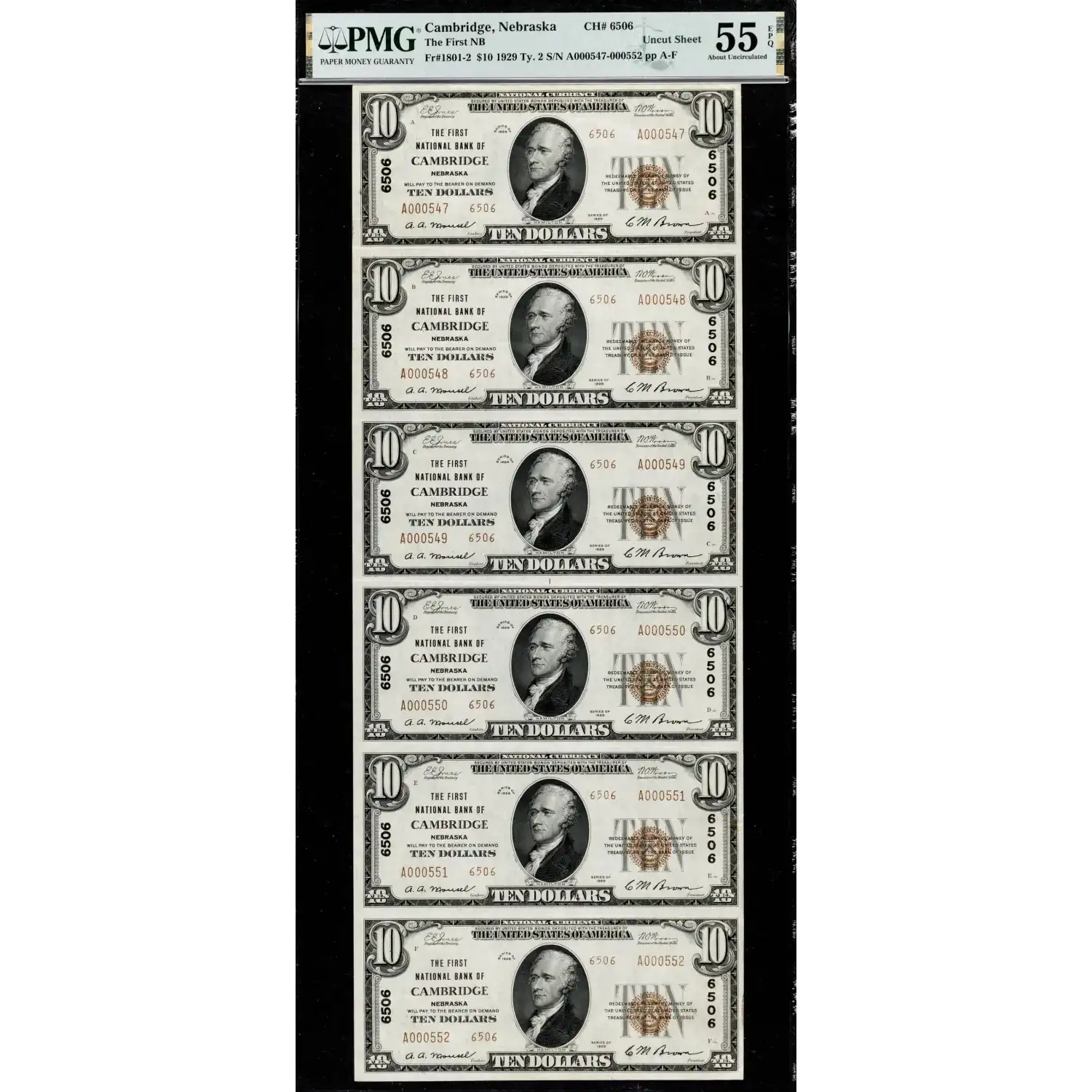 Cambridge, NE - $10 1929 Ty. 2 The First National Bank Ch. # 6506 Uncut Sheet PMG About Uncirculated 55 EPQ.