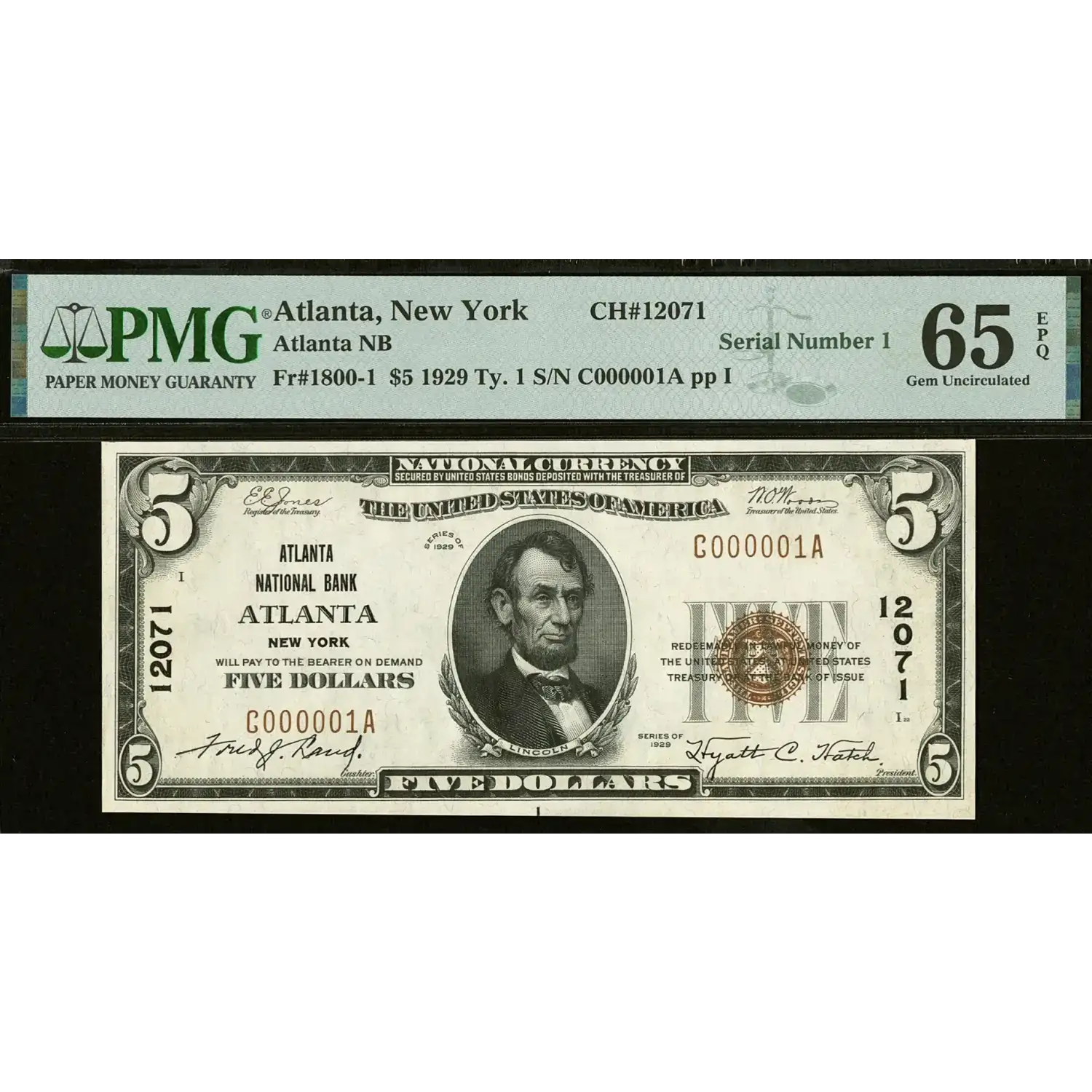 Serial Number 1 Atlanta, NY - $5 1929 Ty. 1 The Atlanta National Bank Ch. # 12071 PMG Gem Uncirculated 65 EPQ.