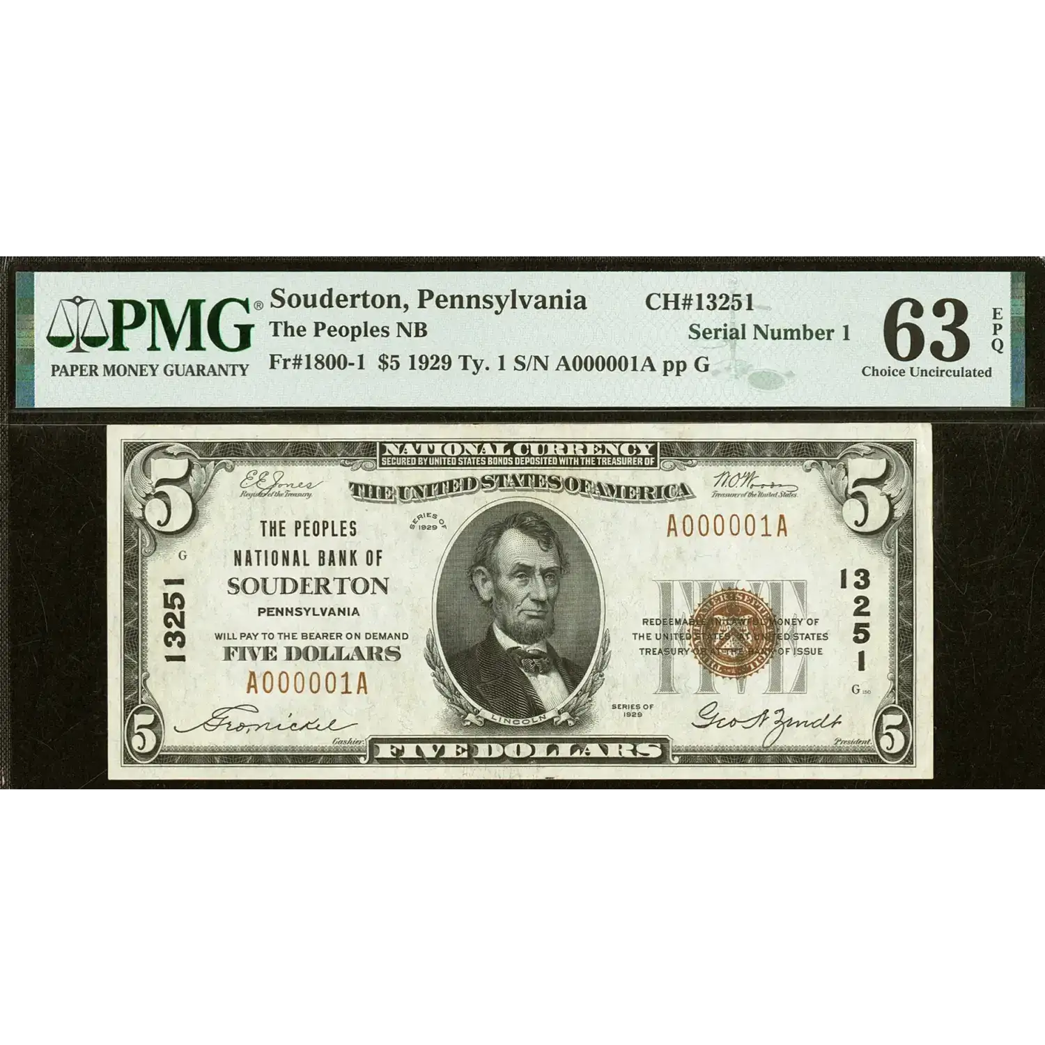 Serial Number 1 Souderton, PA - $5 1929 Ty. 1 The Peoples National Bank Ch. # 13251 PMG Choice Uncirculated 63 EPQ.