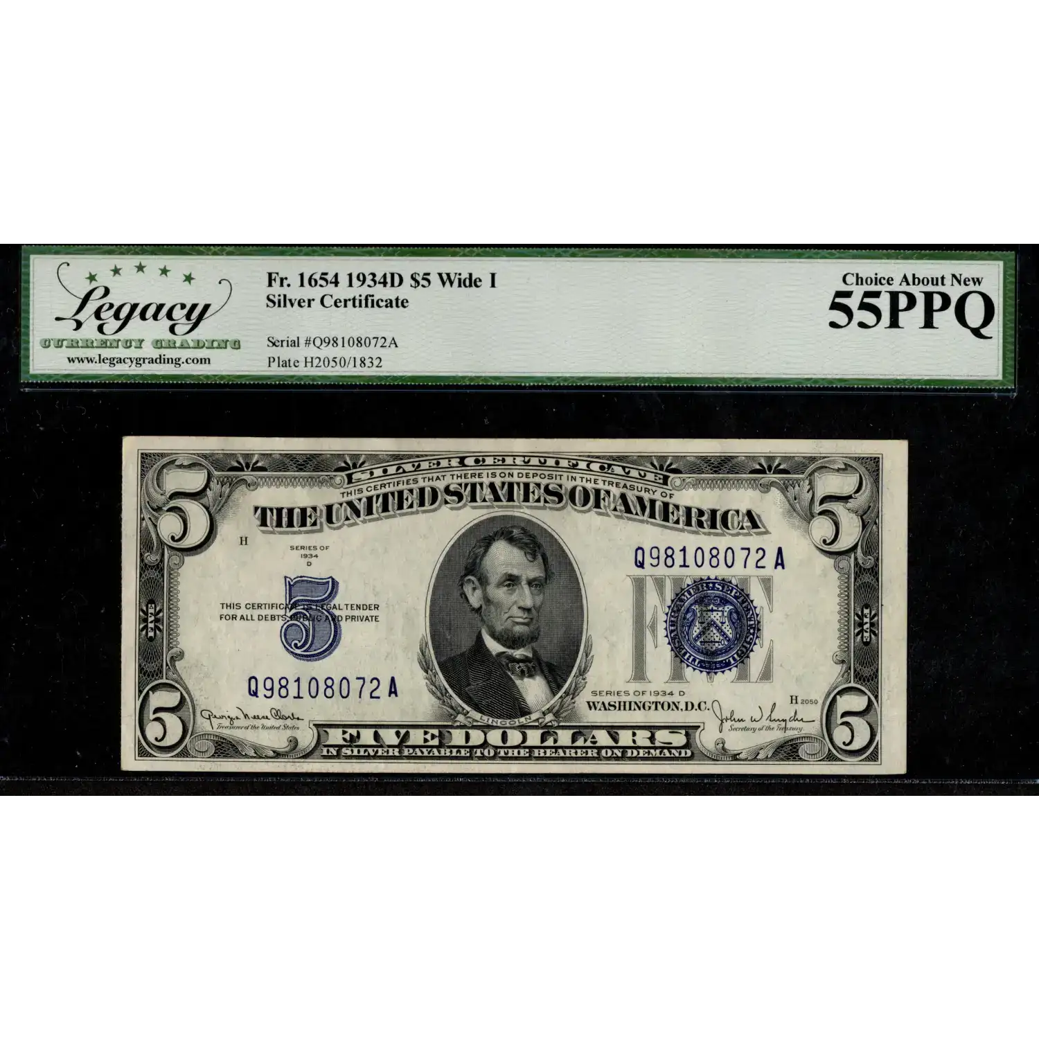 A lovely example of the Wide I Variety of the $5 1934-D Silver Certificate from the Q-A Block.
