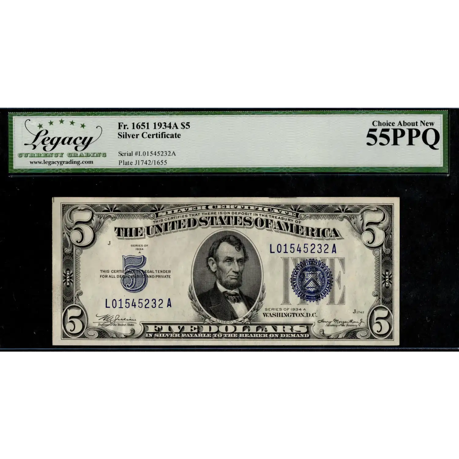 A seemingly uncirculated and fully-original $5 1934-A Silver Certificate!