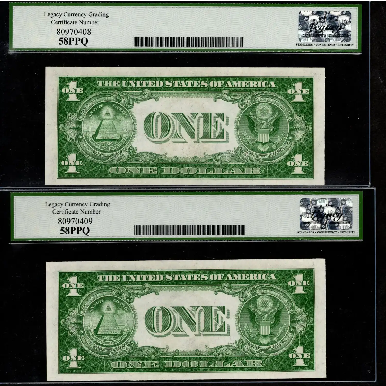 A stunning and sequential pair of $1 1935-A Silver Certificate featuring the signature combination of Julian-Morganthau, Jr. These notes showcase the B-D Block and have been preserved with spectacular eye-appeal in pleasing collector condition.