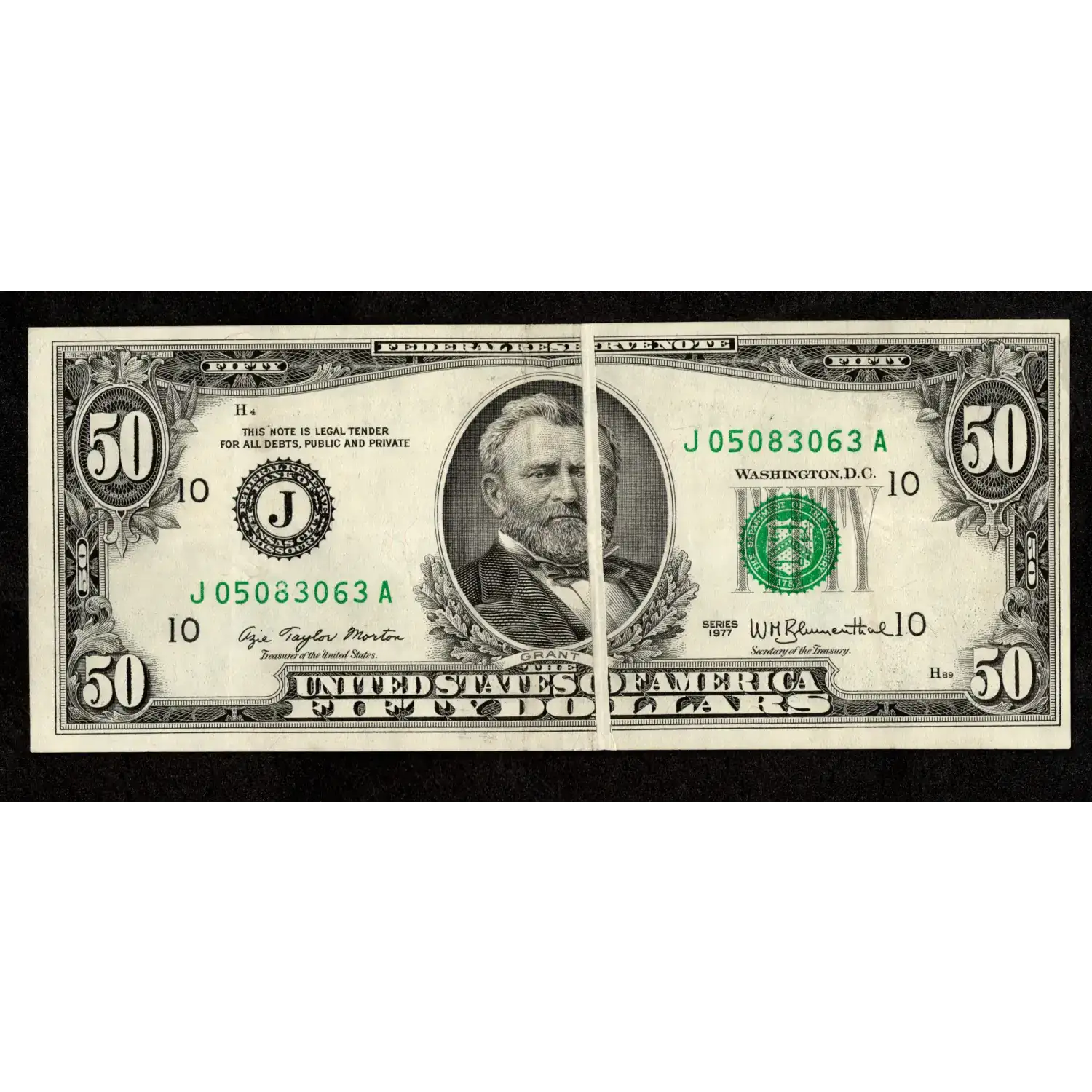 We are so excited we recently acquired this GIGANTIC GUTTER FOLD that spans from the top margin all the way down beyond the bottom margin. This note quickly earned an affectionate nickname around our office, "Three Eyed Grant" as the Gutter Fold interrupts the portrait (specifically near Grant's left eye) making it look like he has three eyes! As error experts, we come across money mistakes daily, but this one brought a little joy to the entire office so we hope it continues to be appreciated by error enthusiasts!