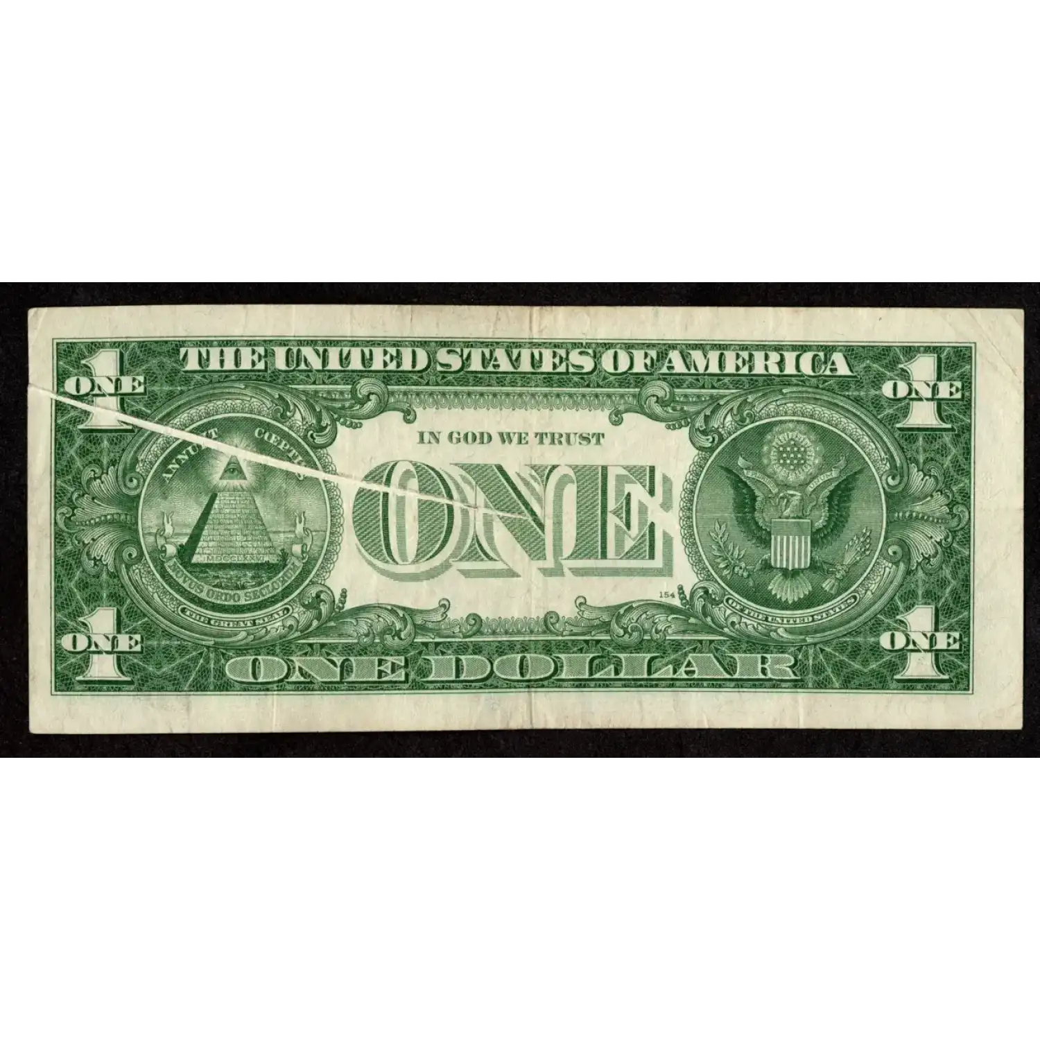 An incredible and exciting gutter fold error that affects ALL THREE PRINTINGS! The sheet pleated prior to the first (back) printing and remaind that way until after the overprint was applied. As you can see, the error is dramatic and easily recognizable, but most impressively, this 3.25" double sided gutter fold error occurs on a silver certificate STAR note!