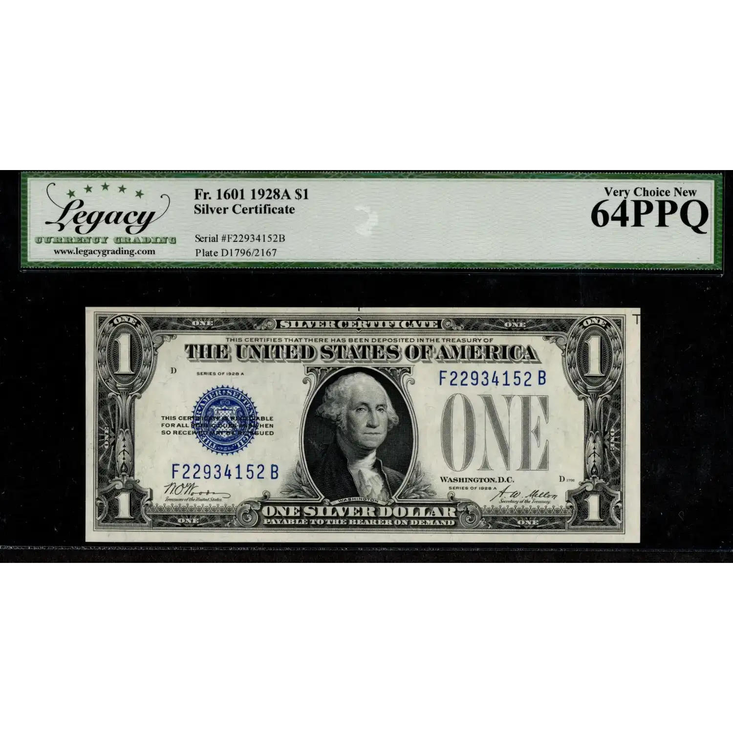 A stunning example of a $1 1928-A Silver Certificate with the Funny Back design.