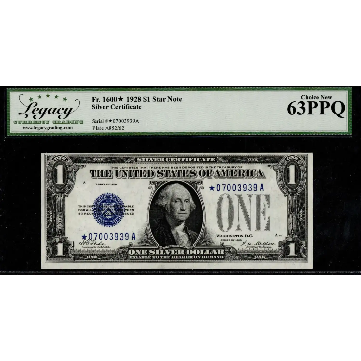 A stunning $1 1928 Silver Certificate STAR, Fr. 1600* preserved in pristine condition with a narrow top margin prohibiting Gem. From the *-A Block, this note is prepared to be shipped to an eager collector that's been awaiting an opportunity secure an attractive example of a Funny Back star from the first year of small size paper money.