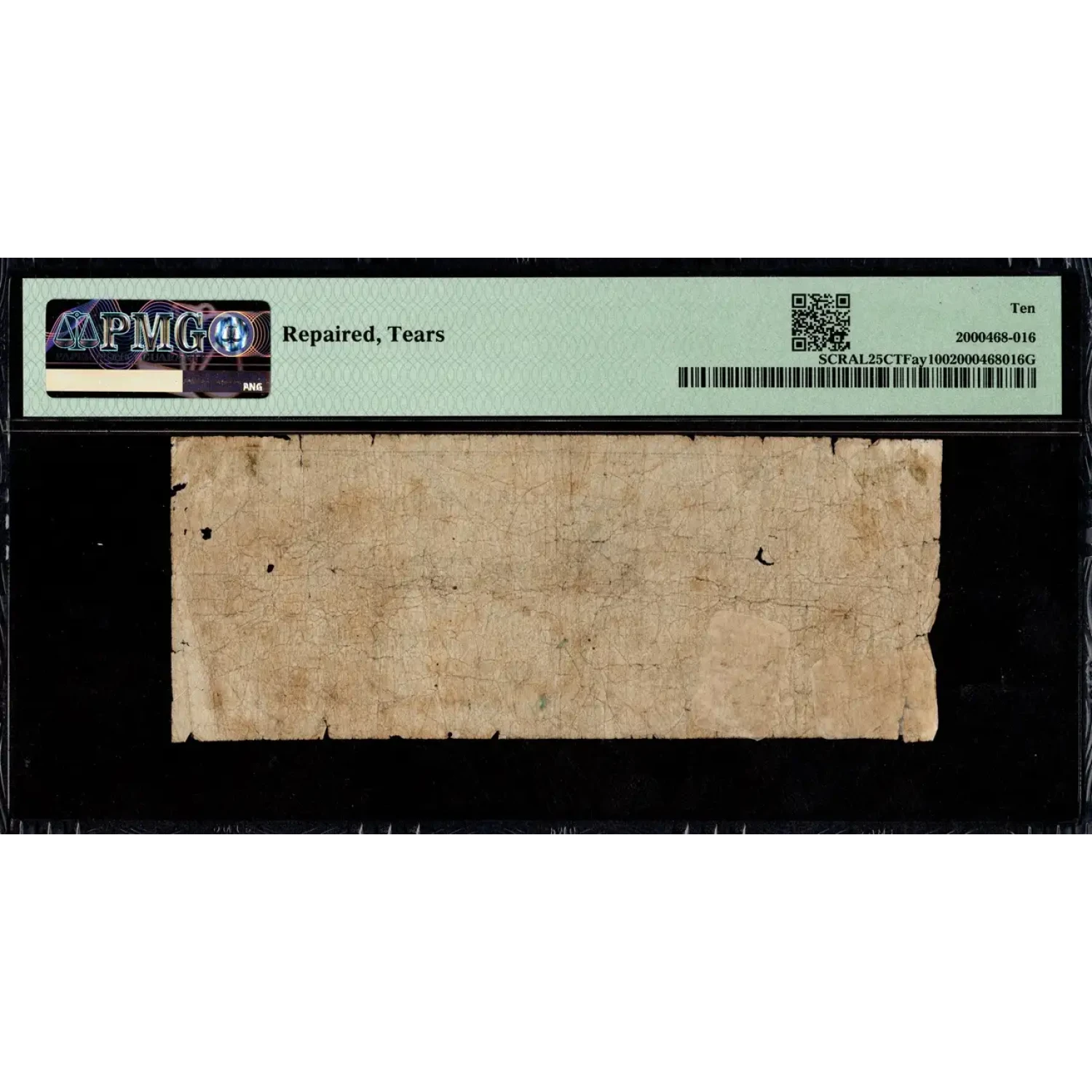 An interesting postmaster issue from Bladon Springs, Alabama. This note was redeemable in Confederate funds when presented in multiples of $5, but could be used to purchase postage or postage stamps. The note has a simple passenger train vignette and is signed by Benjamin Partridge, son of the Postmaster, Daniel Partridge. This denomination is not listed in the Rosene reference. PMG has noted some tears and repairs.