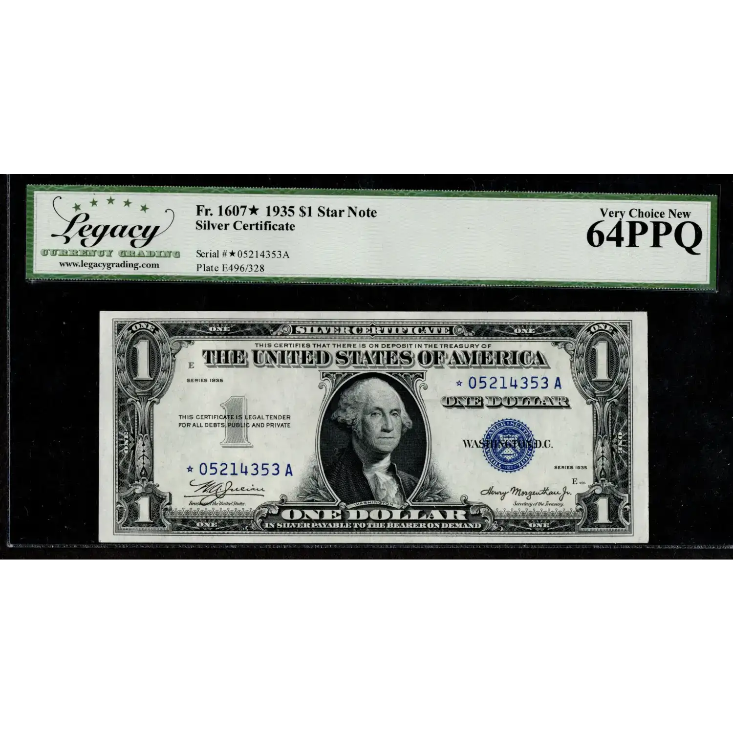 A gorgeous and well embossed replacement note on an early blue seal. $1 1935 Silver Certificate Stars are seldom seen in this state of preservation. We're thrilled to have this example available for an intelligent collector that's been patiently waiting for this note to come along in the right grade and price combination!