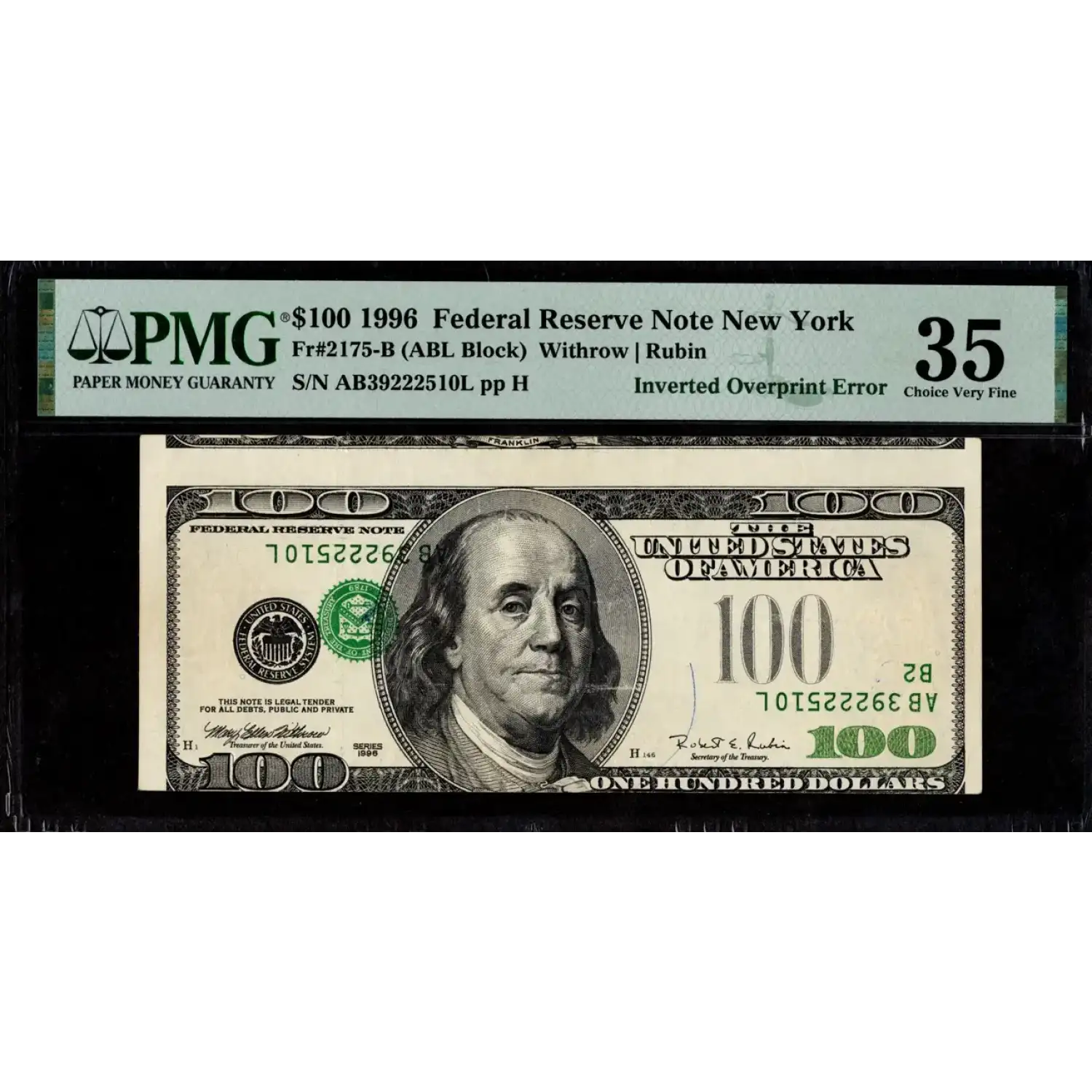 An eye catching Type II error that surprisingly escaped detection prior to being released into circulation by the BEP. Big Head $100 inverted overprint errors are anything but common. This note features the serials and green treasury seal upside down along with the district designator! Most impresively, this note includes a portion of the adjacent note above the extra-wide top margin. There's a single ink line to the right of Franklin's portrait that is responsible for a significant discount for a minor inconvenience. Truthfully, there aren't many opportunities to acquire this error on this denomination; therefore, we're thrilled to have it available for our eager collecting community!