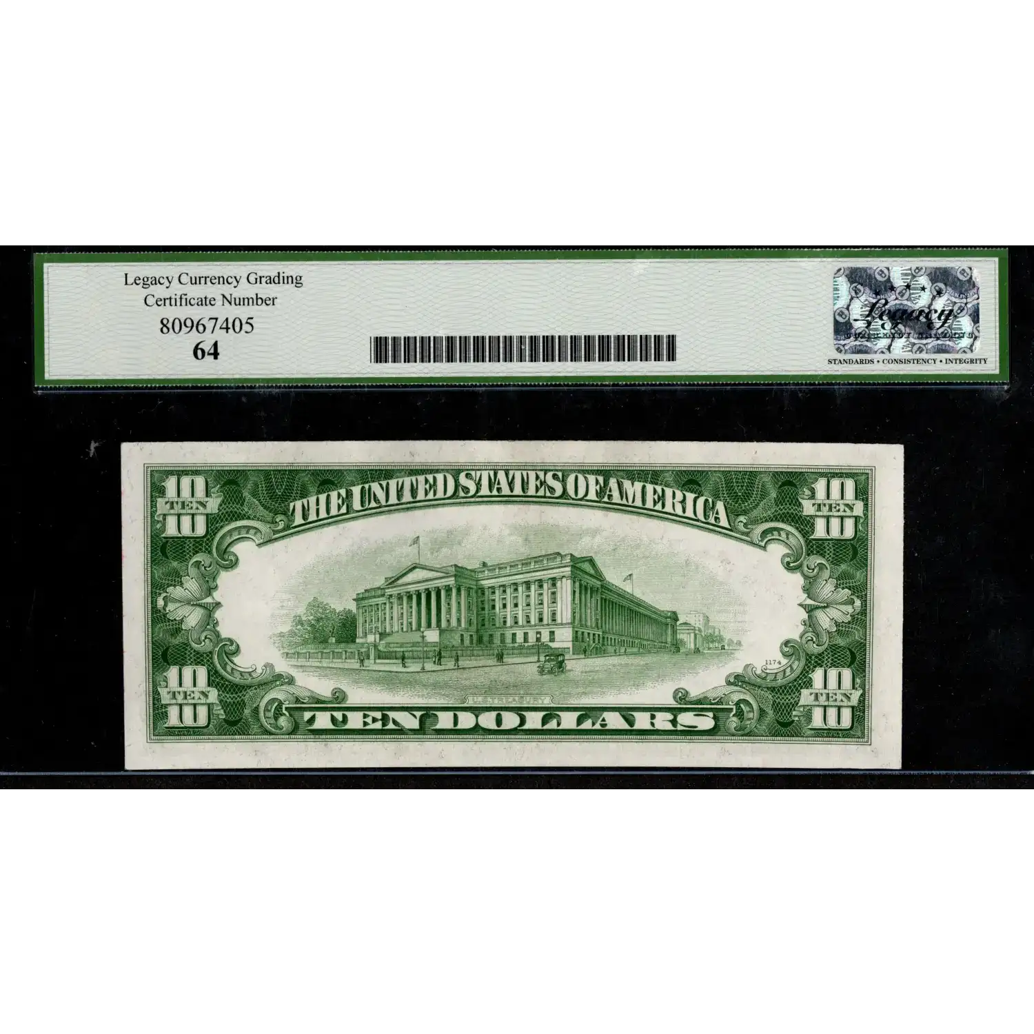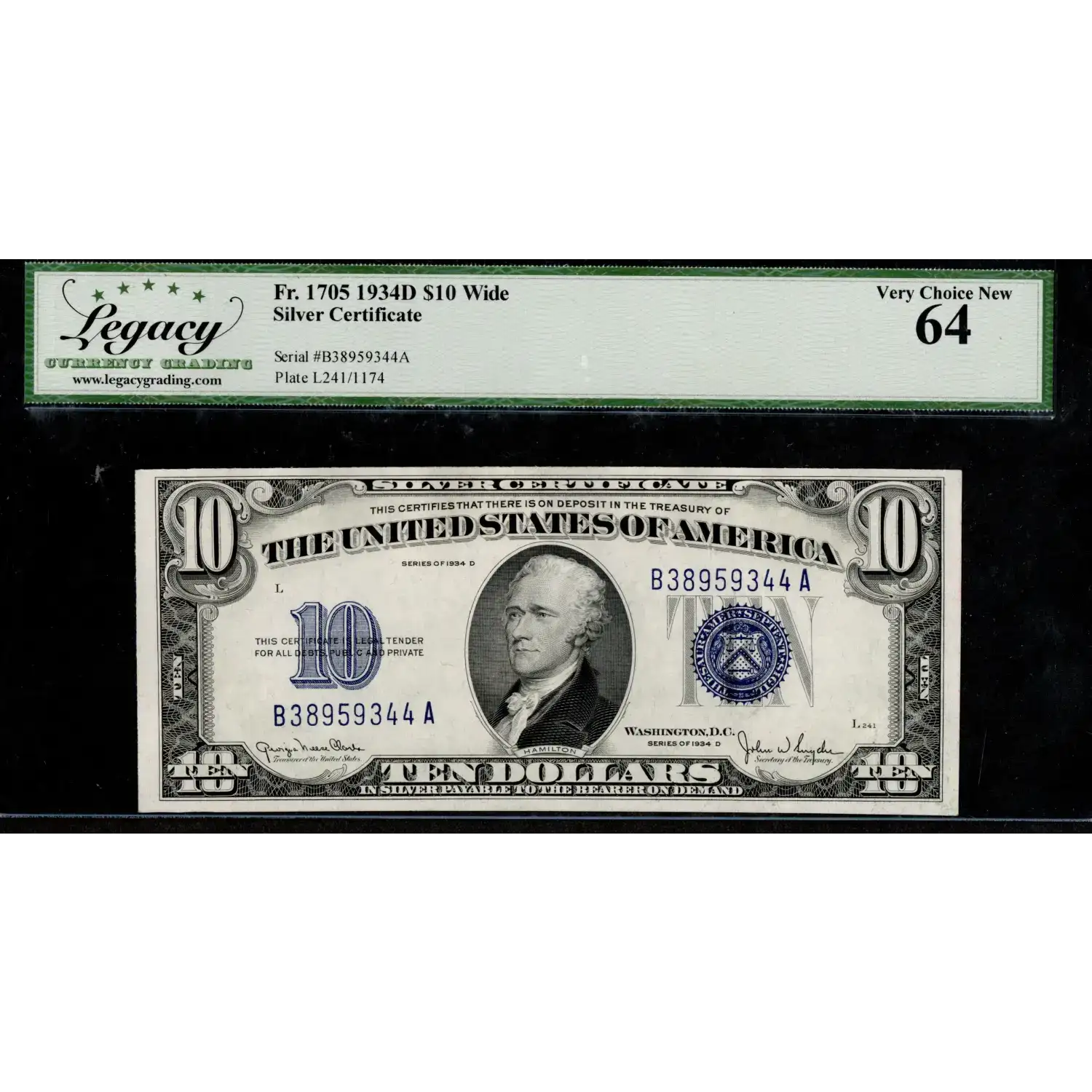 A bright example with bold blue inks and blazing white paper! This note looks like it was just printed yesterday and offers a high-grade and stunning example of a WIDE $10 1934-D Silver Certificate.