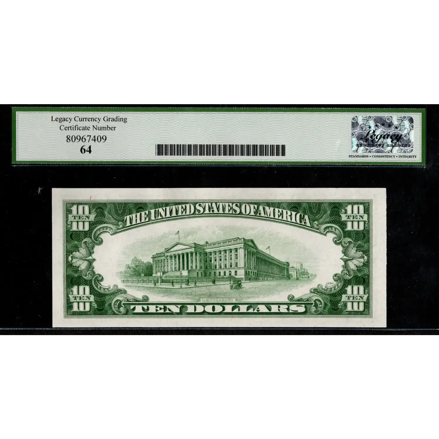 A bright example with bold blue inks and blazing white paper! This note looks like it was just printed yesterday and offers a high-grade and stunning example of a WIDE $10 1934-D Silver Certificate.
