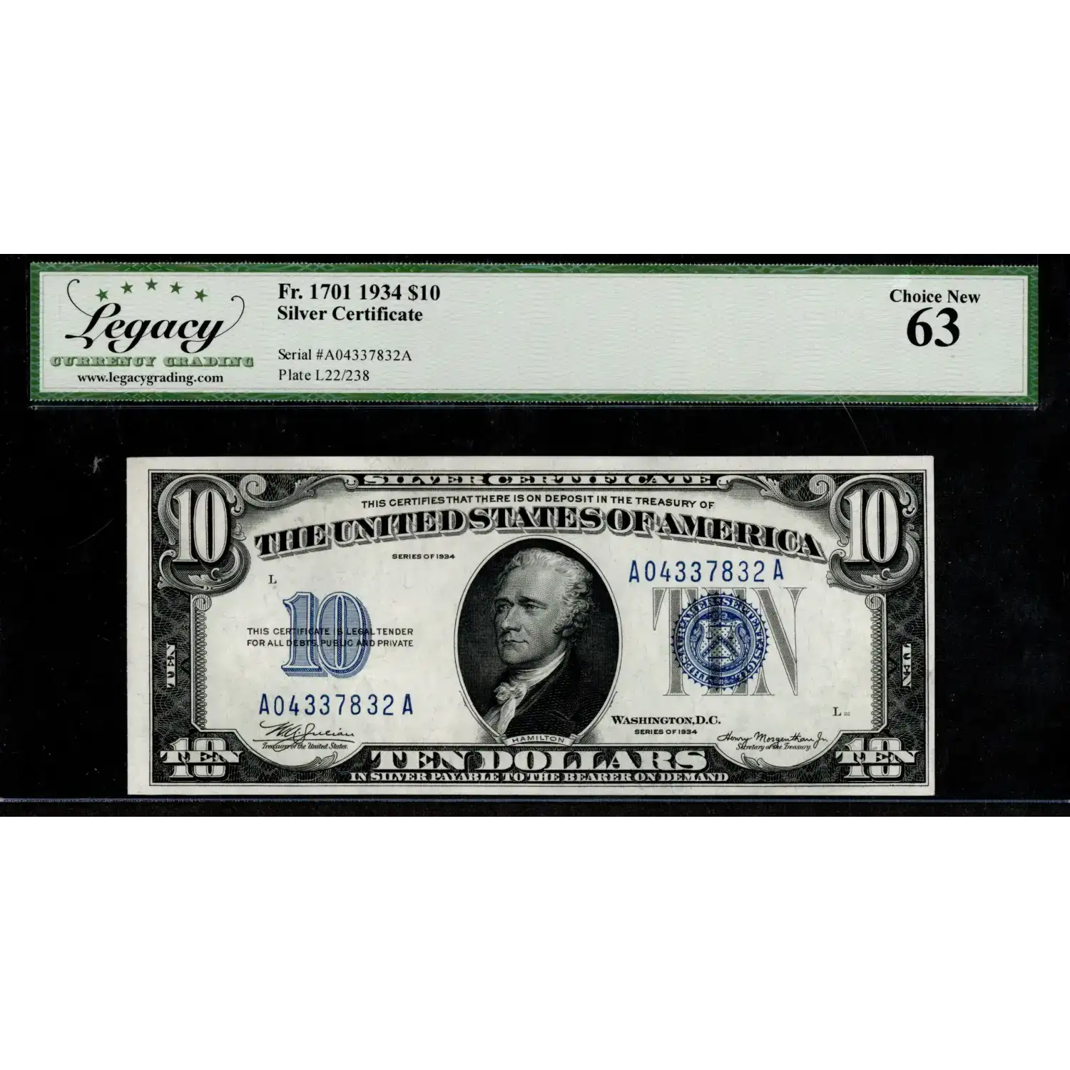 A handsome Hamilton with a bright blue seal and bold blue serials which perfect compliment the paper on this early silver certificate ten.