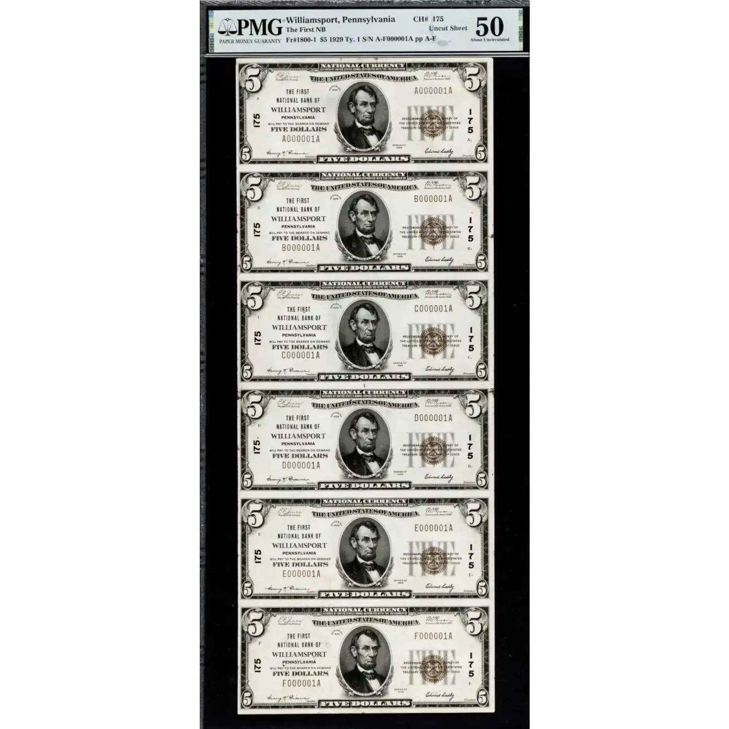 This attractive all-Serial Number 1 uncut sheet comes from this low-charter number Lycoming County bank that is new to the census. Williamsport is well known as the home of the Little League World Series and notes from this charter are always in demand due to the baseball connection. There is minor evidence of a previous mounting, but this sheet faces up nicely with bright paper and bold ink colors.
