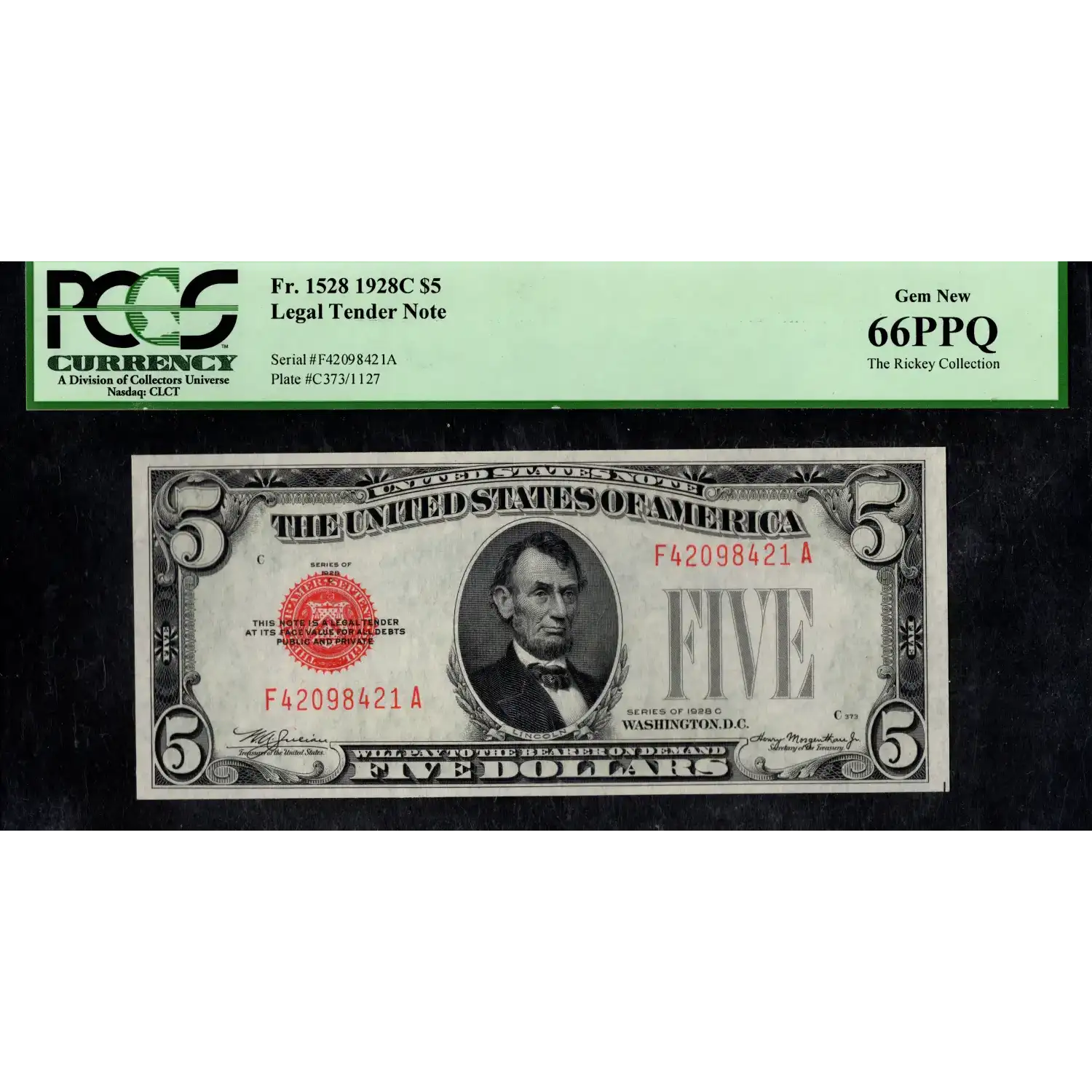 Original surfaces, generous and even margins, and a fire-engine red overprint are some of the highlights of this early 1928-C five dollar legal tender that's positioned one point shy of Superb Gem.