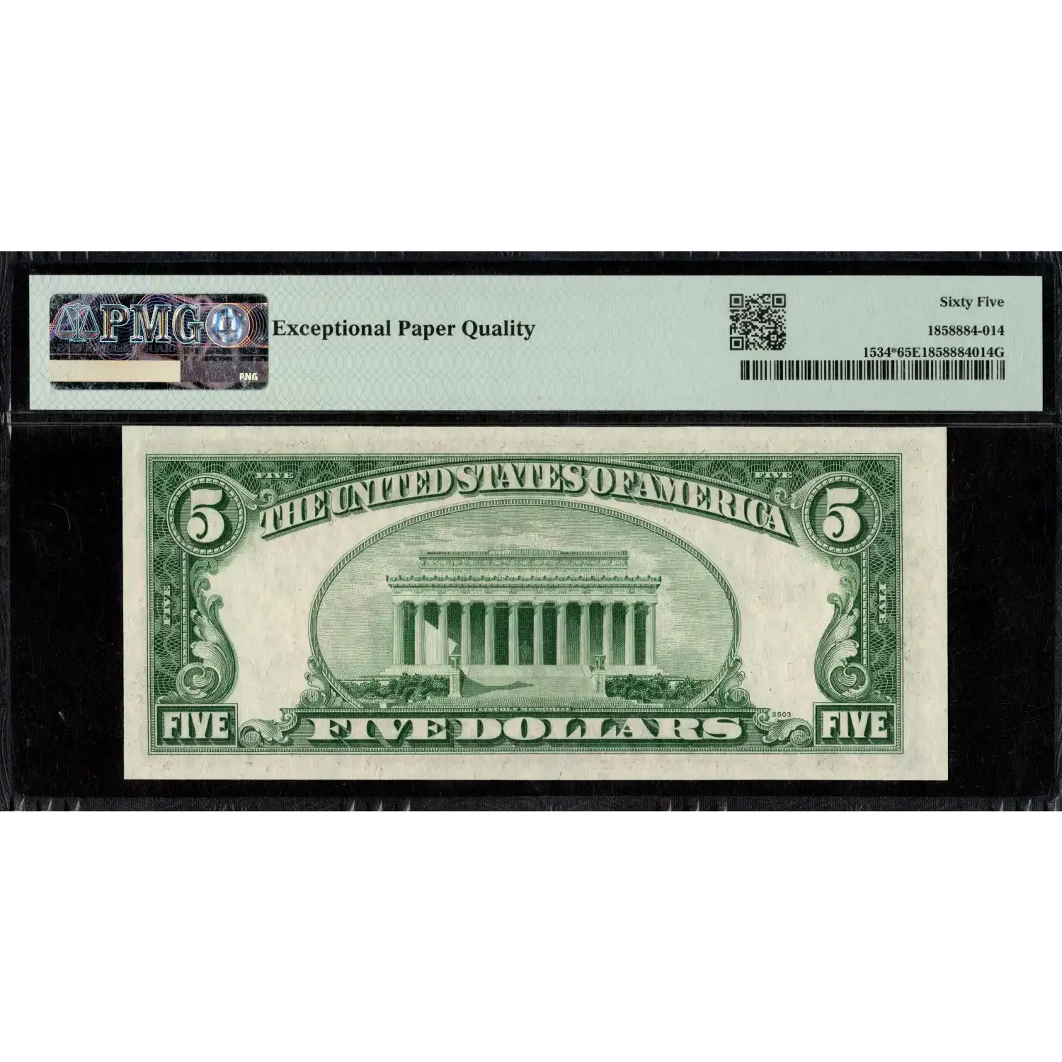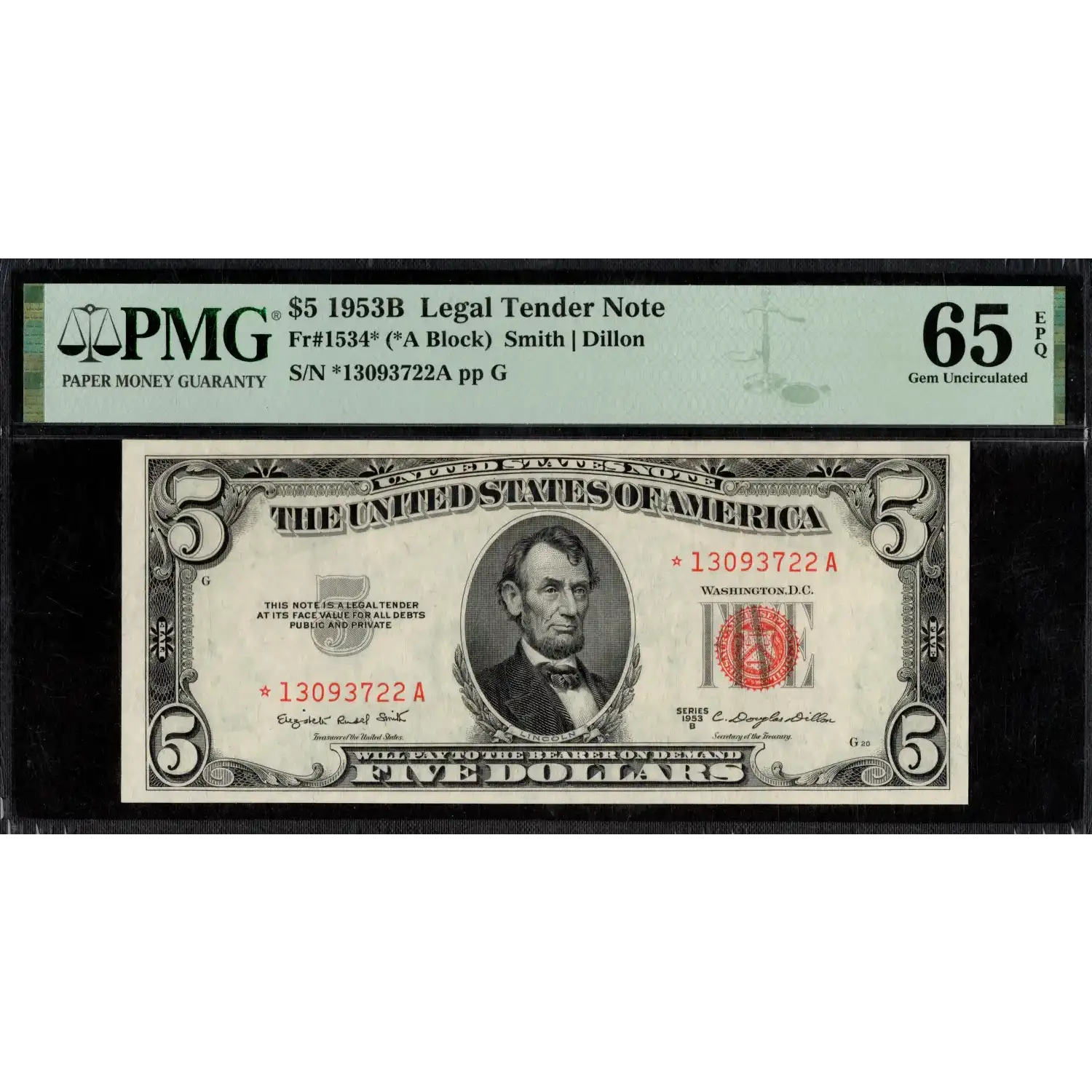 Enjoy a stunning $5 1953-B Legal Tender Replacement (STAR) note preserved in pristine condition with exceptional margins! The last two Gems sold by Heritage realized $312 in May of 2025 and November of 2024. As such, we're thrilled to have this one available so cheaply for one of our loyal collectors to secure!