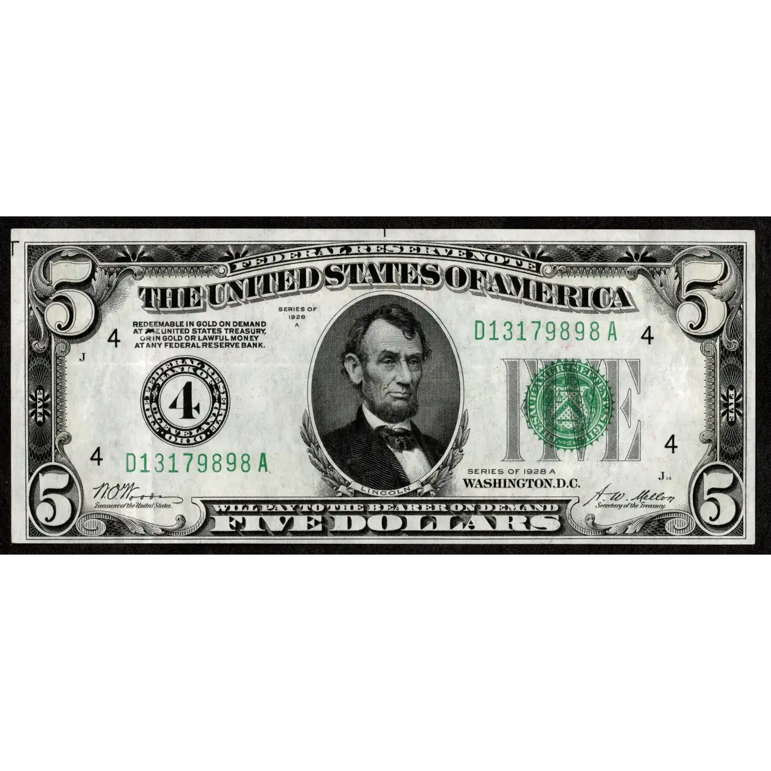 An attractive example of a Numeral Seal Five from the fourth district of Cleveland, OH. This note features the popular "Redeemable in Gold" clause and has been preserved with limited and gentle handling offering a great look at an even better price!