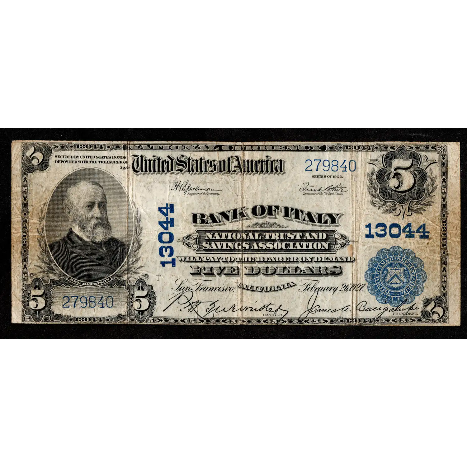 An attractive Bank of Italy note that that bears this famous San Francisco bank's popular first title and has the engraved signatures of Cashier R.B. Burmister and President J.A. Bacigalupi.