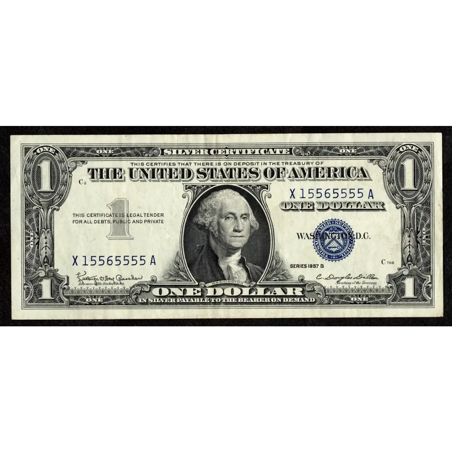 An impressive near solid serial on the final series of silver certificates. This blue seal ace has six digits that are identical, making it an impressive near solid, six of a kind fancy serial!