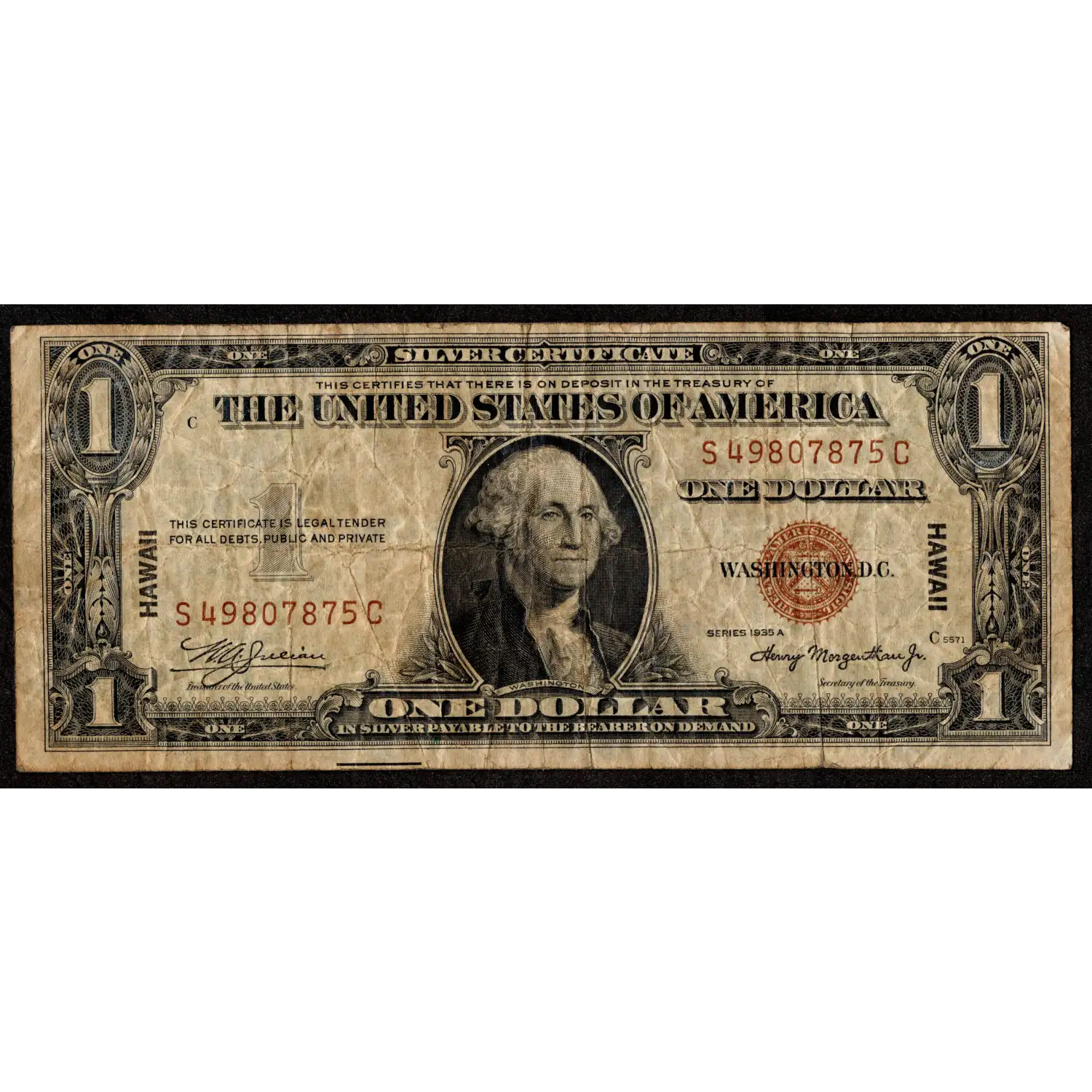 A historic piece of WWII currency, this $1 1935-A Hawaii note was issued after the attack on Pearl Harbor as part of a special emergency series. These notes feature brown seals and overprints, and were created so that—if the islands fell to enemy forces—the U.S. government could quickly declare them worthless to protect mainland currency reserves.
