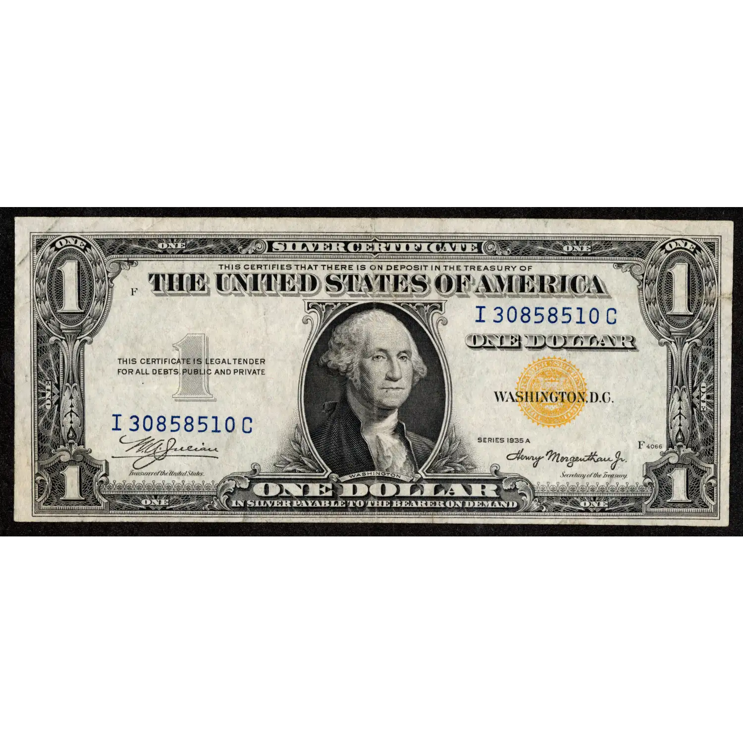 This $1 1935-A North Africa Silver Certificate is part of the special WWII Emergency Issue series printed for U.S. troops operating in the North African and Mediterranean theaters. These notes feature the distinctive yellow Treasury seal—a design chosen so that, if large quantities were captured by enemy forces, the U.S. government could easily identify and invalidate them without disrupting the national money supply.
