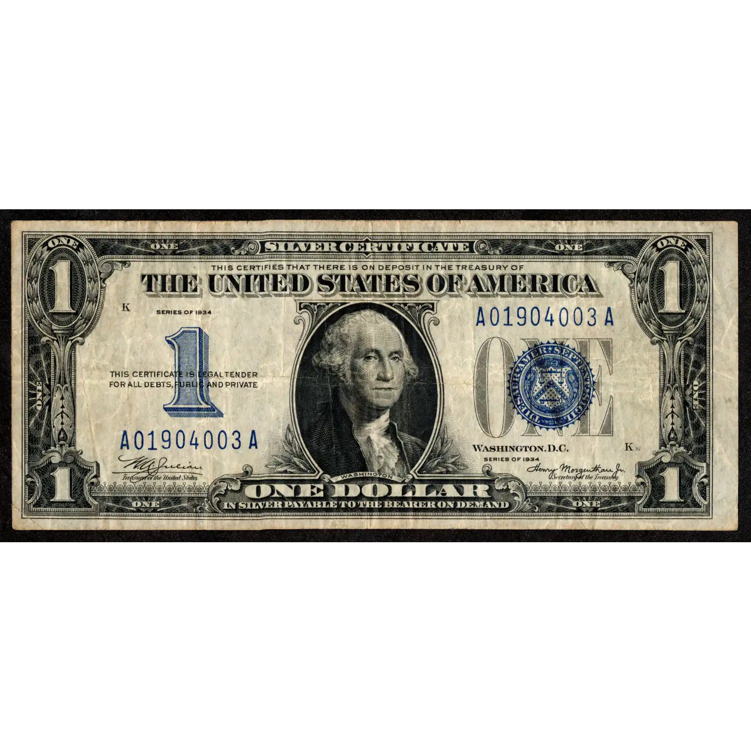 A classic and highly collected early small-size type, this 1934 $1 Silver Certificate (Fr. 1606) features the striking big blue “ONE” printed to the left of Washington’s portrait—an eye-catching design element used for only one year before the series was redesigned.