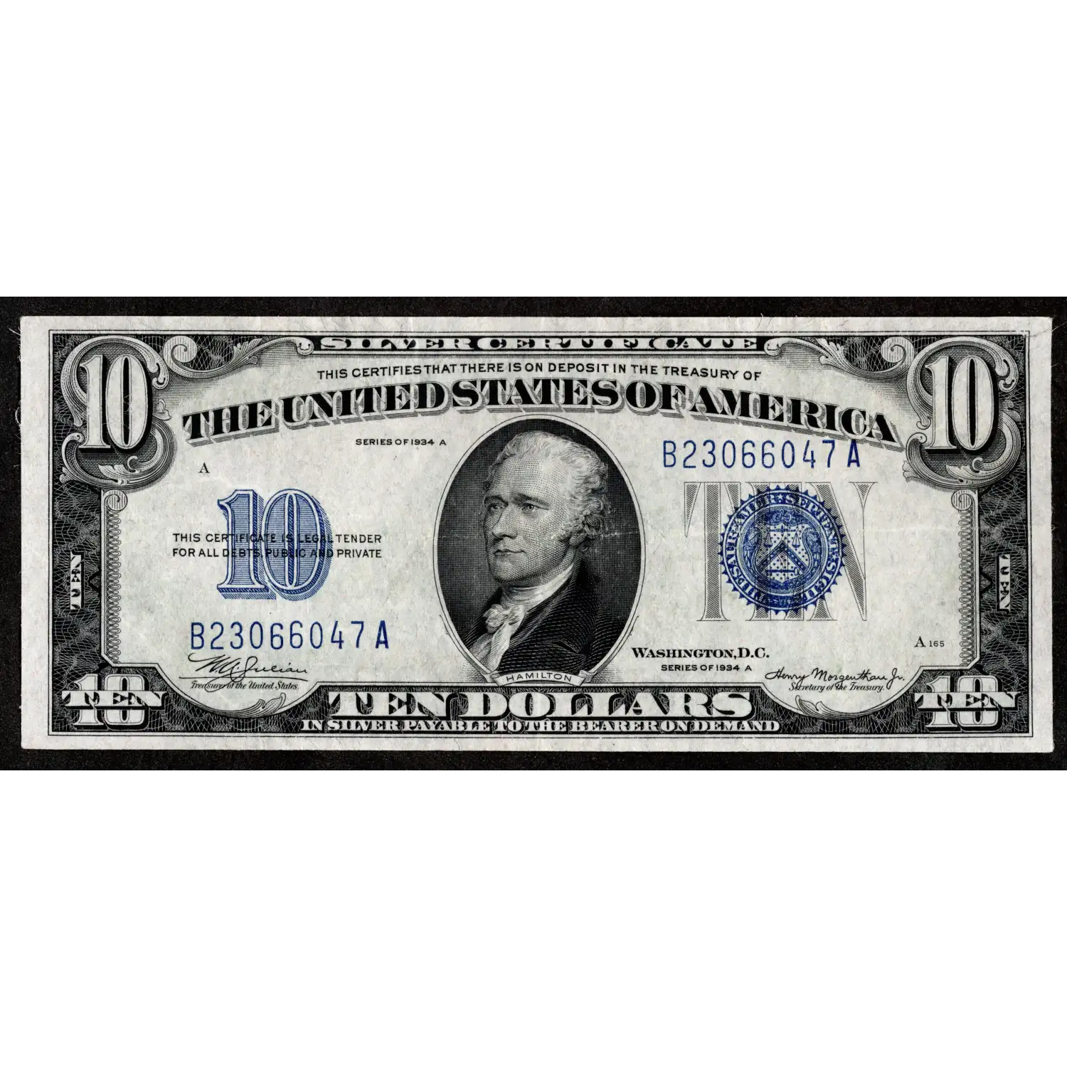 A sharp and attractive example of the 1934-A $10 Silver Certificate, this Fr. 1702 offers far better visual appeal than its technical grade suggests. The paper is bright, the overprints bold, and the overall presentation is clean and well-balanced—an excellent GREAT LOOKING note.
